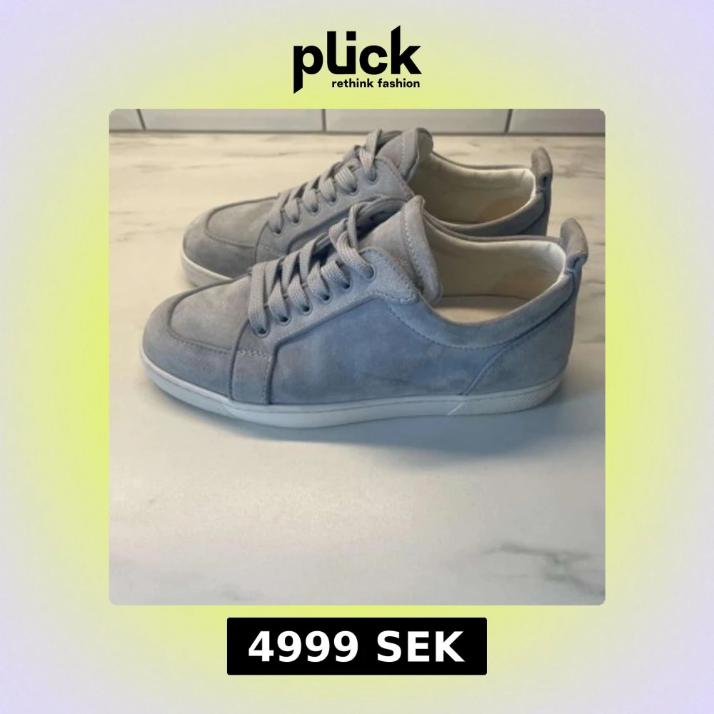 Säljer ett par stilrena sneakers från Christian Louboutin i mocka med klassisk röd sula. Skorna har rund tå, platt sula och snörning. Perfekta för dig som vill ha en lyxig och clean look.
