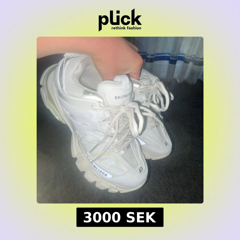 Säljer ett par vita chunky sneakers från Balenciaga med coola detaljer och grov sula. Skorna har snörning, meshpaneler och Balenciaga-logga på sidan och plösen. Perfekta för dig som gillar statement-skor och streetstyle.
