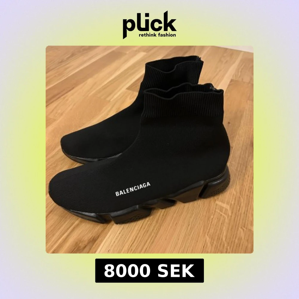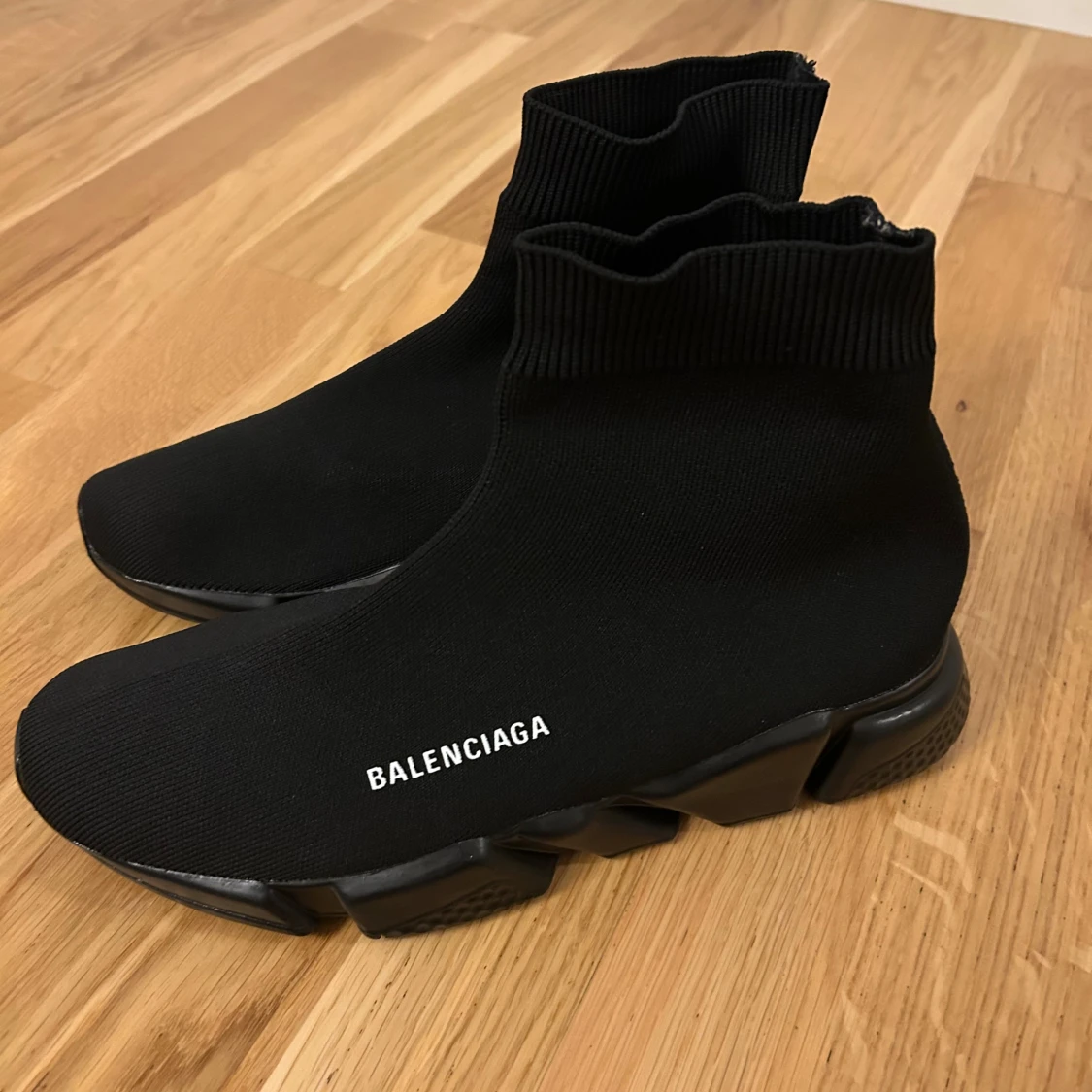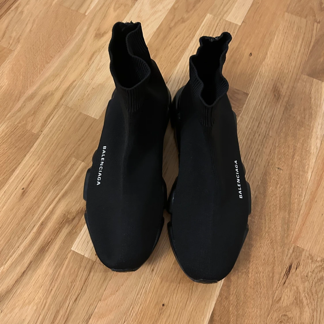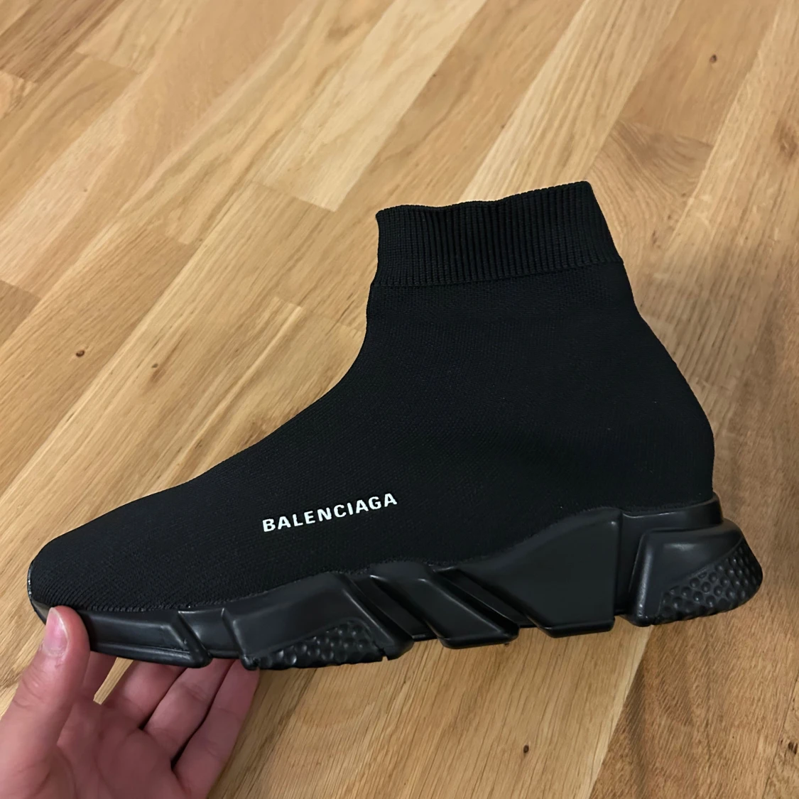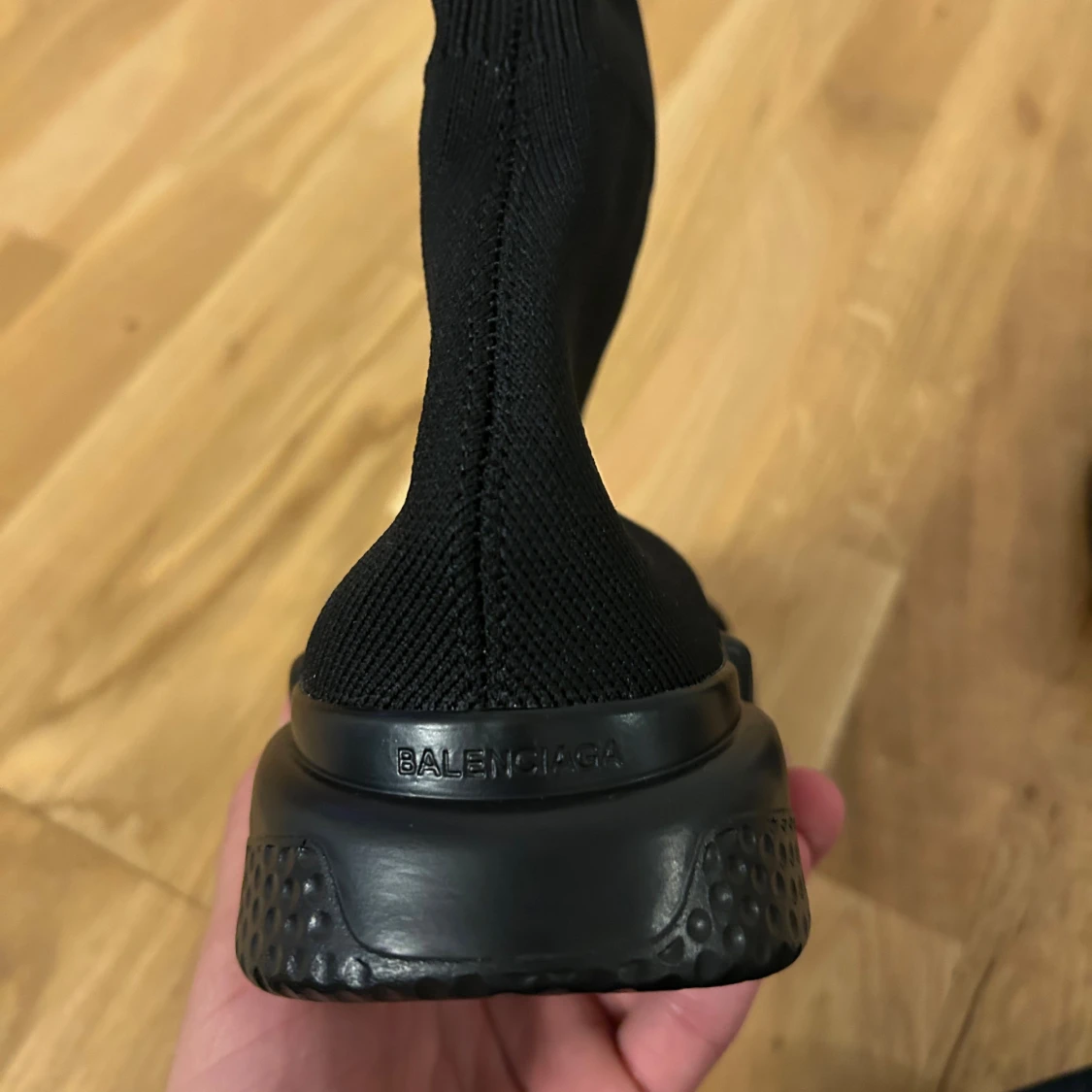 Svarta Balenciaga Speed Trainer sneakers med stickad ovandel i syntetmaterial och chunky svart sula. Strumpliknande passform med ribbad kant och Balenciaga-logga på sidan och hälen. Snygg futuristisk vibe och superbekväma att bära.
