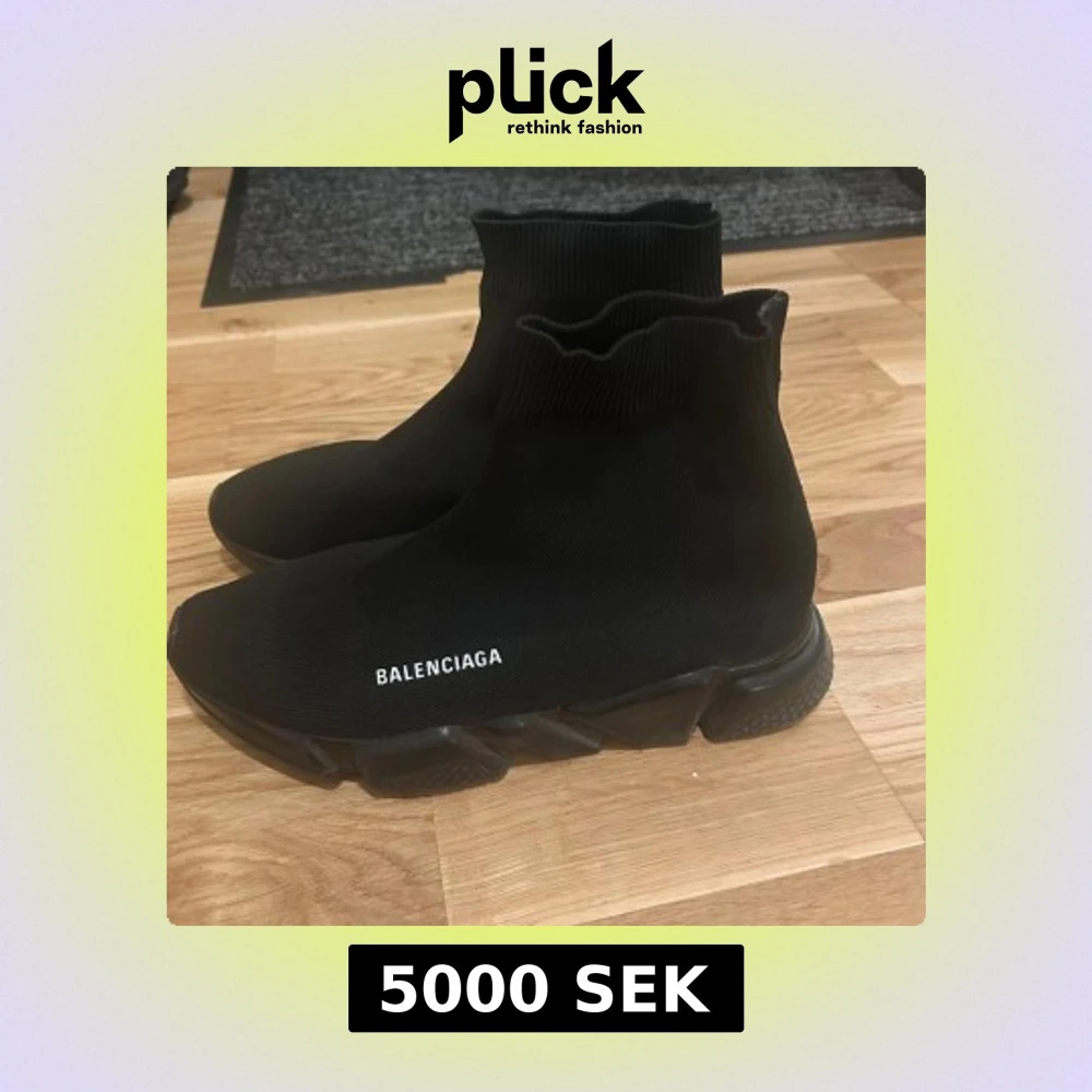 Svarta Balenciaga Speed Trainer sneakers med strumpliknande ovandel i stretchig textil och chunky svart sula. Minimalistisk design med vit Balenciaga-logga på sidan. Skorna har rund tå och platt sula för en clean och modern look.