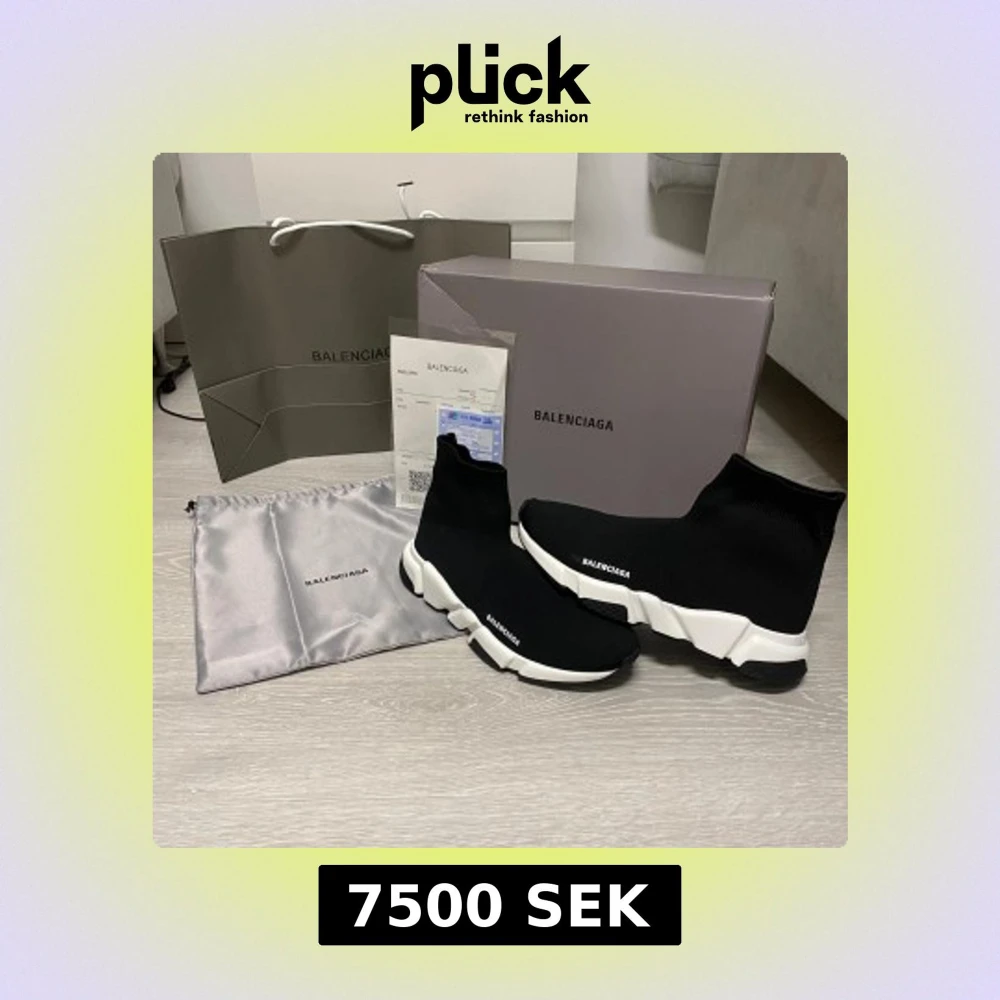 Svarta Balenciaga Speed Trainer sneakers med vit chunky sula och stickad ovandel i syntetmaterial. Strumpliknande passform och logga på sidan. Supersnygga och trendiga skor som ger en sportig vibe till din outfit.