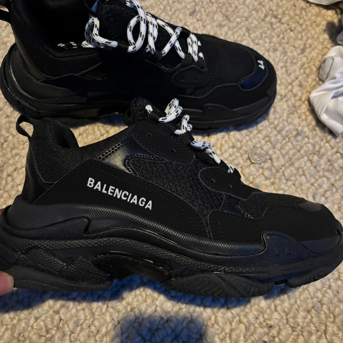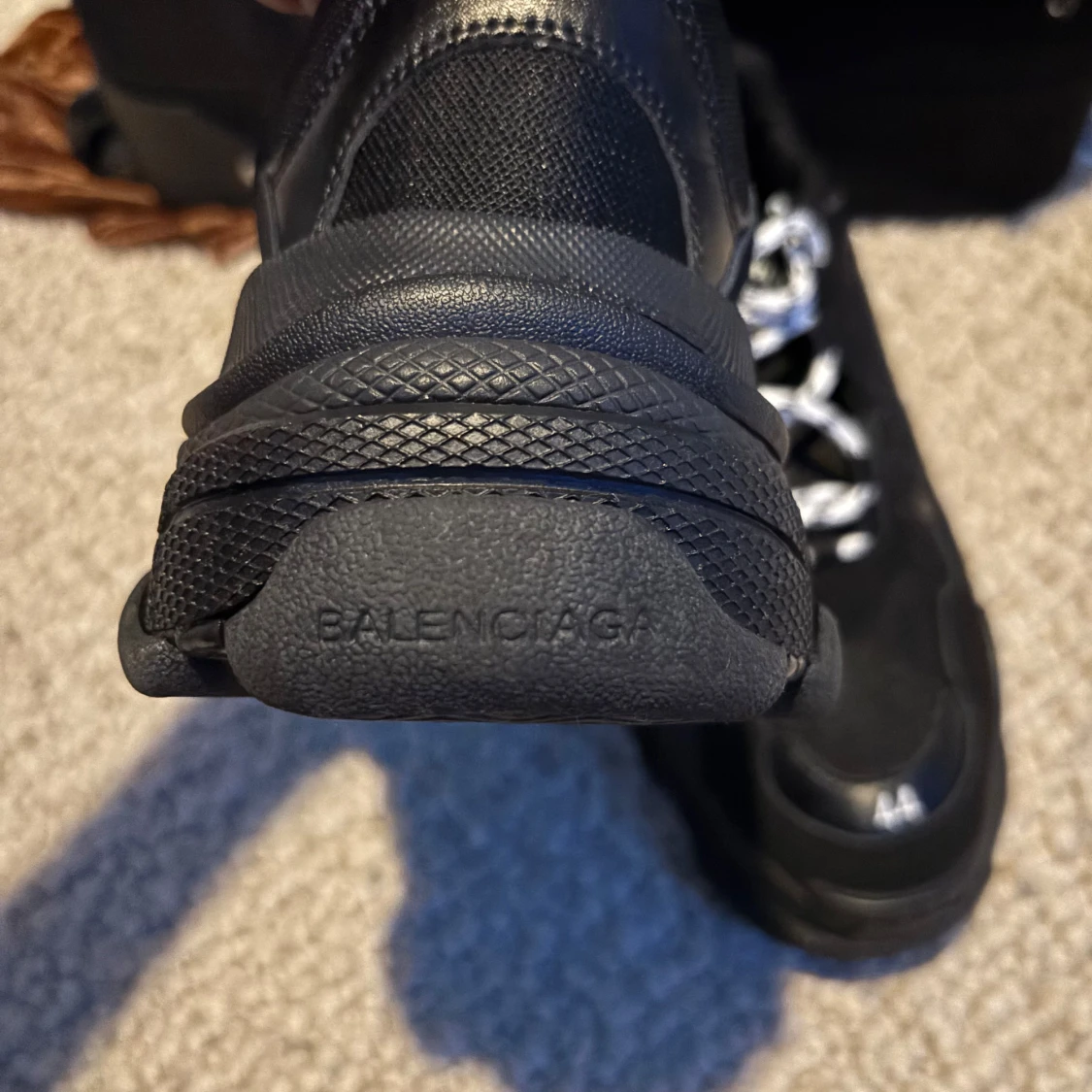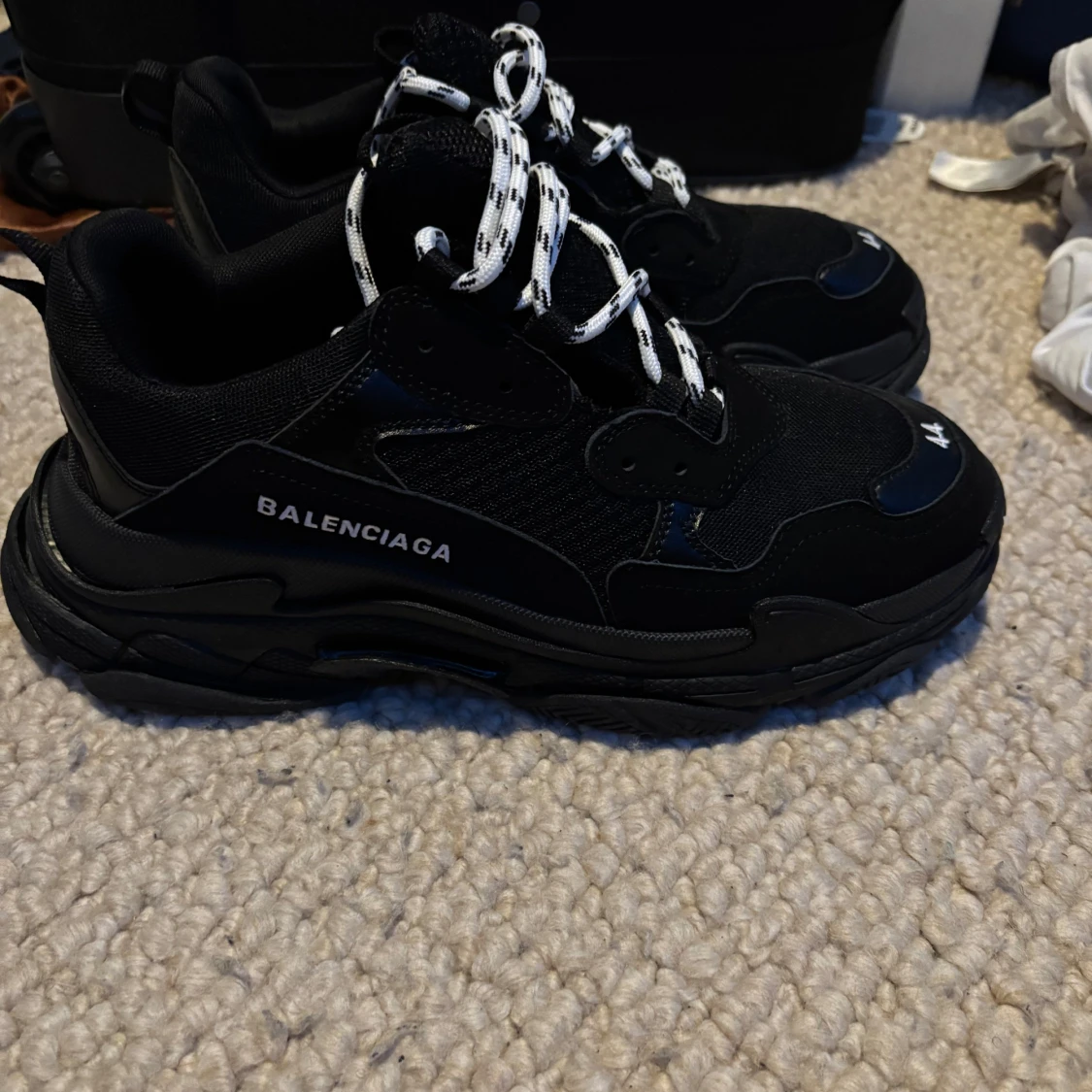 Chunky svarta Balenciaga Triple S sneakers med vit-svarta snören och tydlig logga på sidan, svart-vita snören ingår också. Har använt Max två gånger bara så de är relavivt nya. Skorna va inte riktigt min stil men är perfekta för dig som gillar street-style sneakers. Priset kan diskuteras