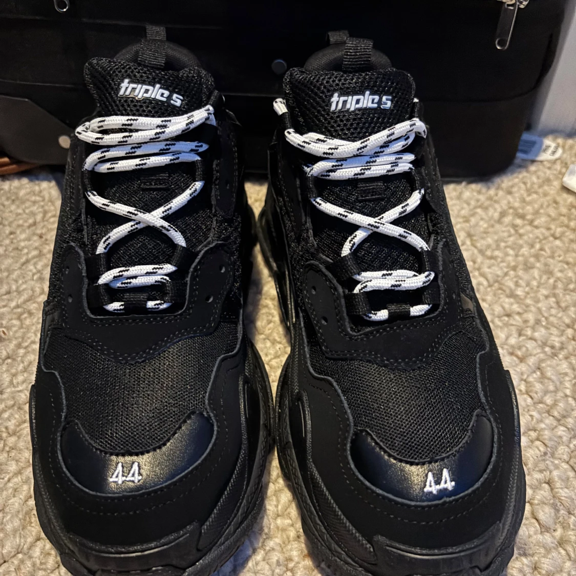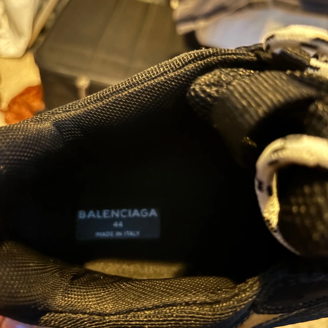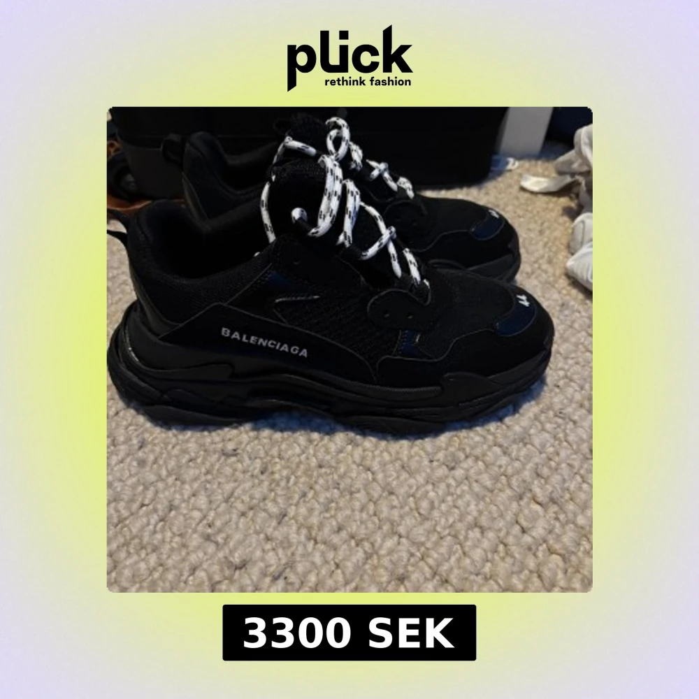 Chunky svarta Balenciaga Triple S sneakers med vit-svarta snören och tydlig logga på sidan, svart-vita snören ingår också. Har använt Max två gånger bara så de är relavivt nya. Skorna va inte riktigt min stil men är perfekta för dig som gillar street-style sneakers. Priset kan diskuteras