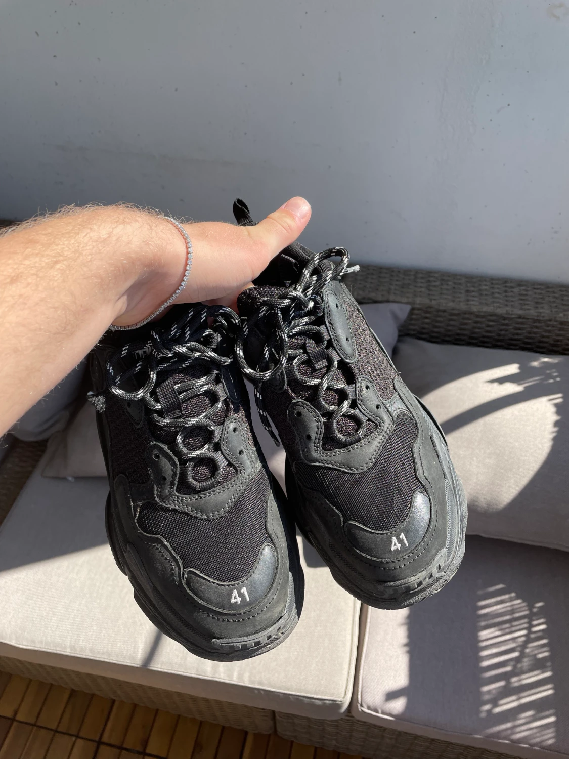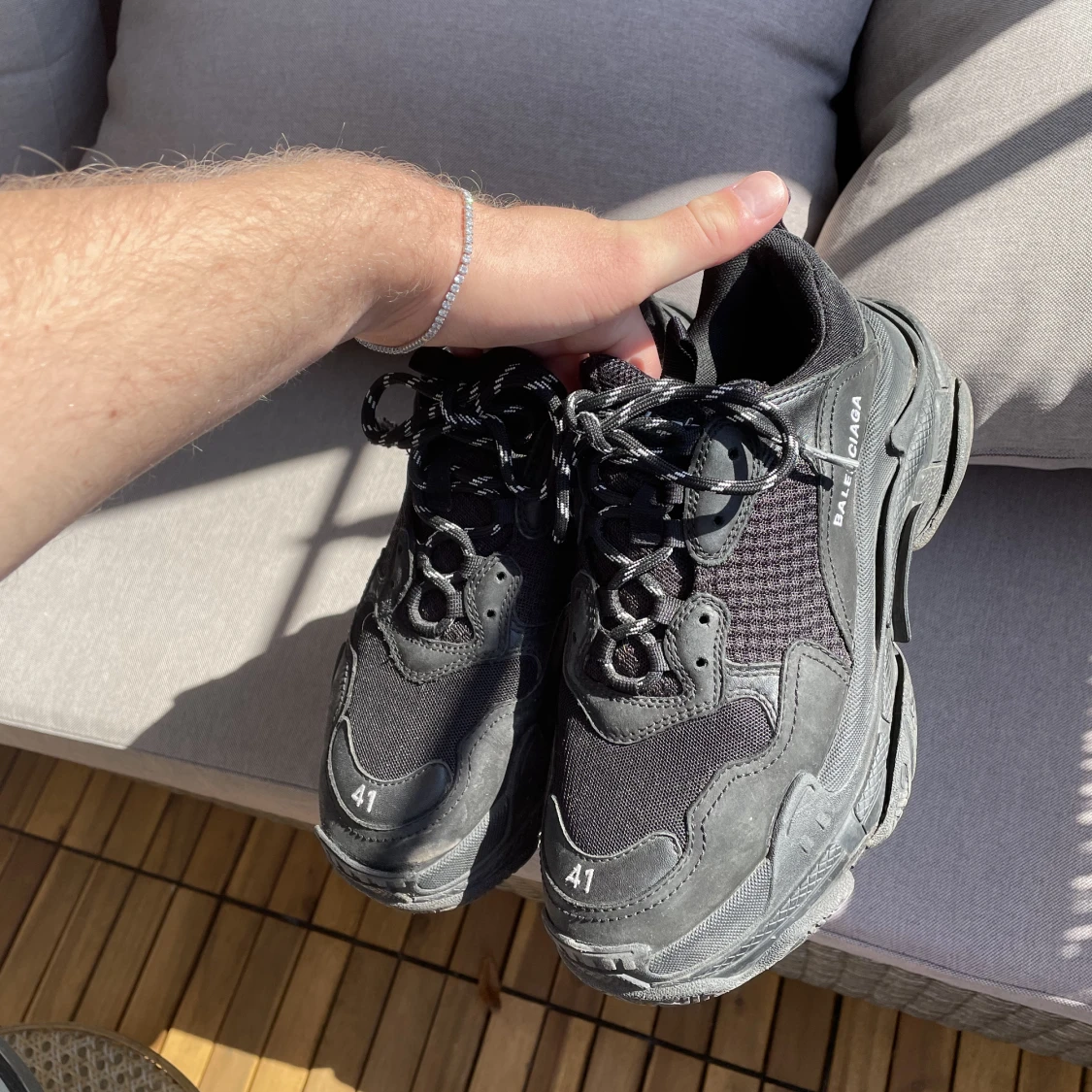 Balenciaga Triple S all black Storlek 41, sitter som 42-43 Skick 8/10 Ingen box men kvitto finns Kan mötas runt Markaryd eller skickas Kan tänka mig byte mot Alexander Mcqueens