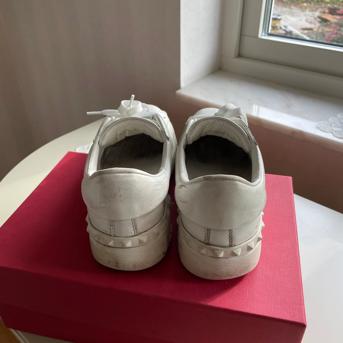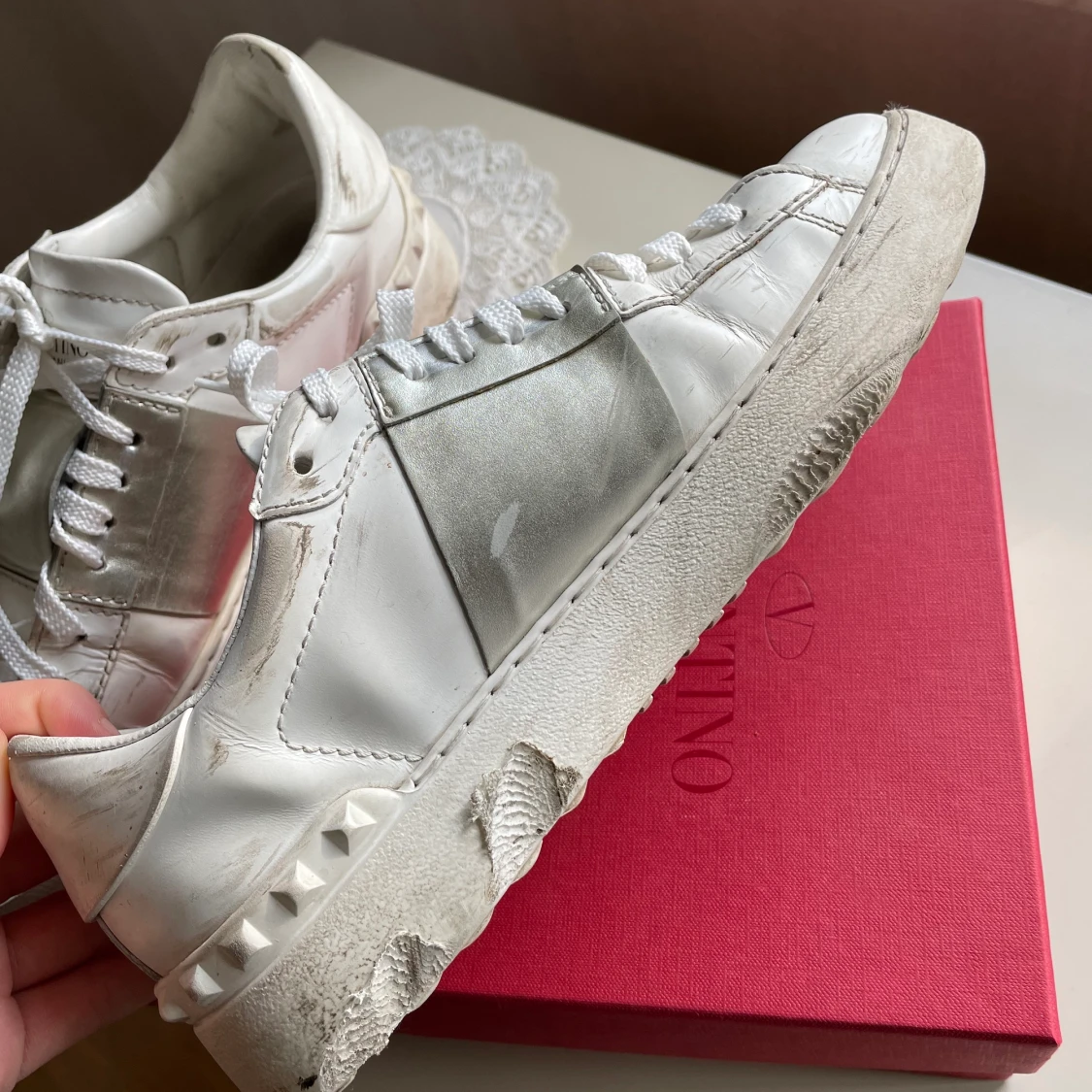 Säljer mina väldigt använda valentino sneakers. Är storlek 39 och kartong samt dustbag för skorna medföljer. Känns fel att slänga så fina skor så hoppas på att någon vill ge dem lite kärlek innan de gjort sitt! Har tvättat av dem men går att fixa ännu mer, sedan har jag bytt skosnörena till de extra som följer med. VID SNABB AFFÄR KAN PRIS DISKUTERAS