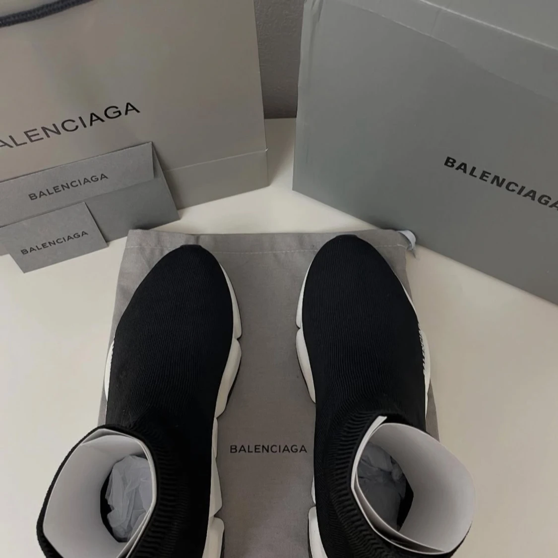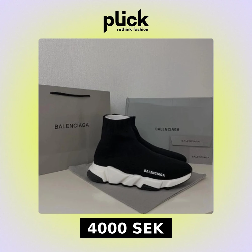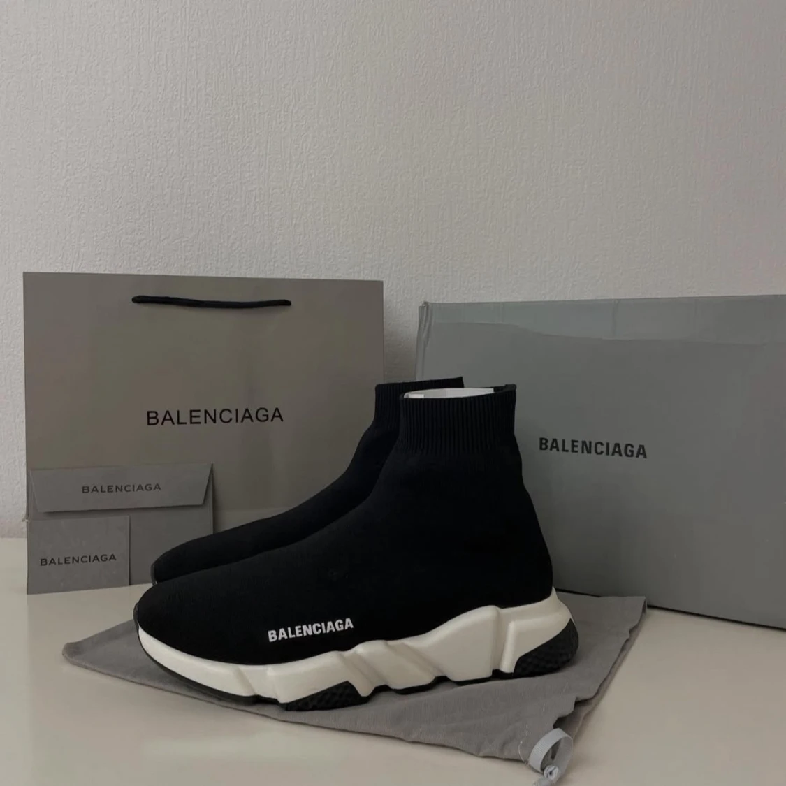 Svarta Balenciaga Speed Trainer sneakers med vit chunky sula och stickad ovandel i stretchigt material. Strumpmodell med rund tå och Balenciaga-logga på sidan. Superlätta och bekväma för en clean och modern look. Såklart följs allting med skorna säljer de för billigt eftersom inte använder de. MALMÖ