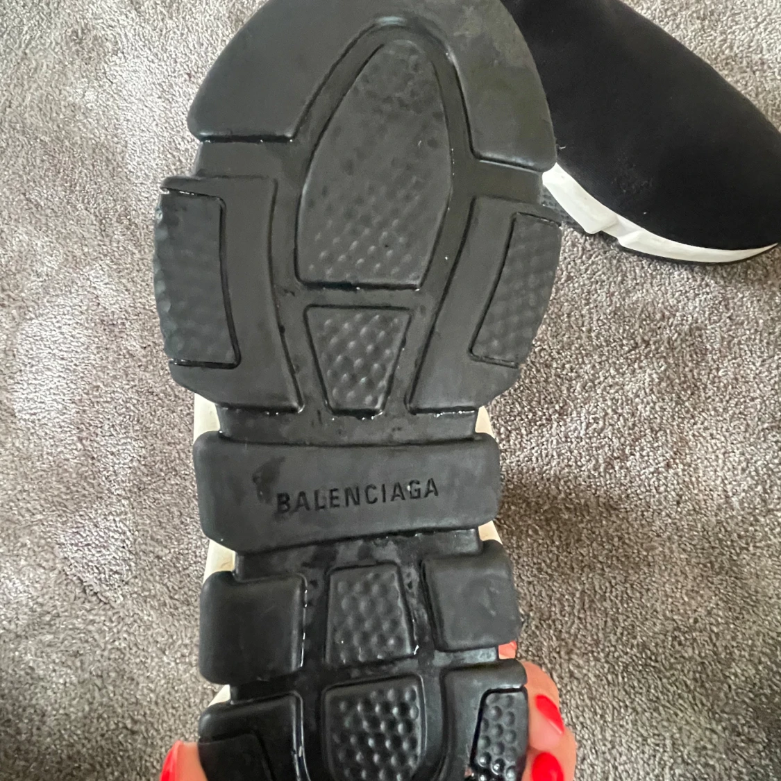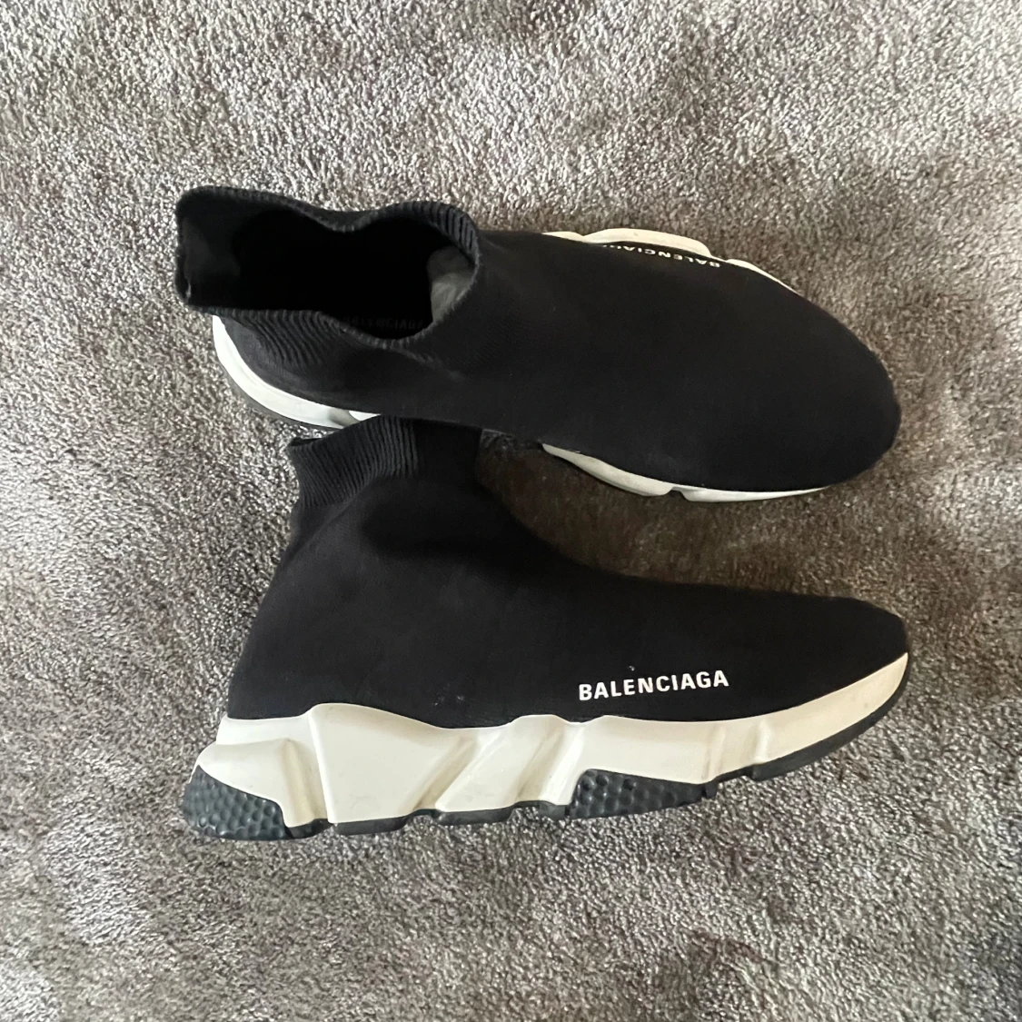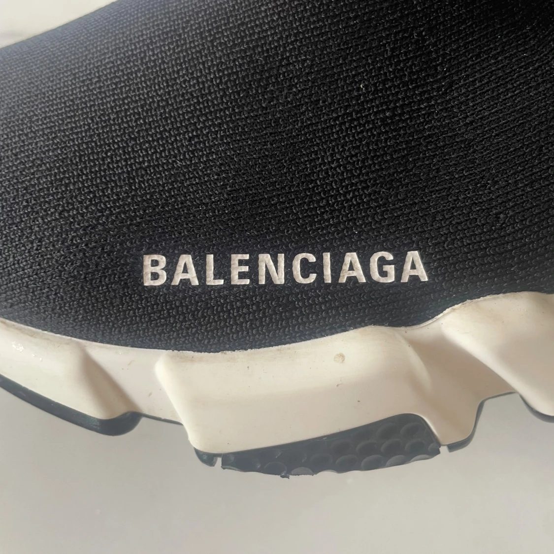 Svarta Balenciaga Speed Trainer sneakers med vit chunky sula och stickad ovandel i syntetmaterial. Strumpliknande passform och tydlig Balenciaga-logga på sidan. Snygg och futuristisk design med platt sula och rund tå.