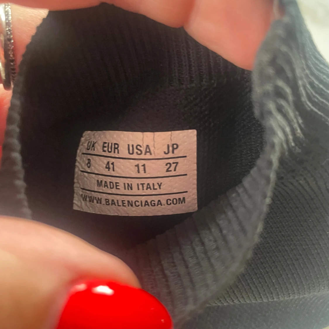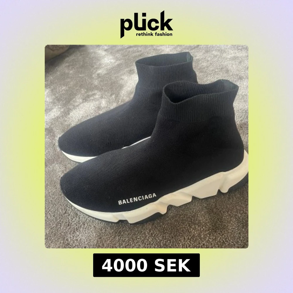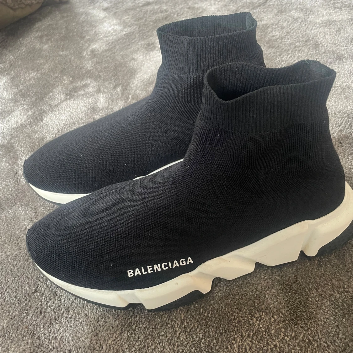 Svarta Balenciaga Speed Trainer sneakers med vit chunky sula och stickad ovandel i syntetmaterial. Strumpliknande passform och tydlig Balenciaga-logga på sidan. Snygg och futuristisk design med platt sula och rund tå.