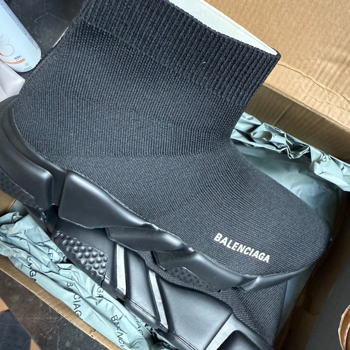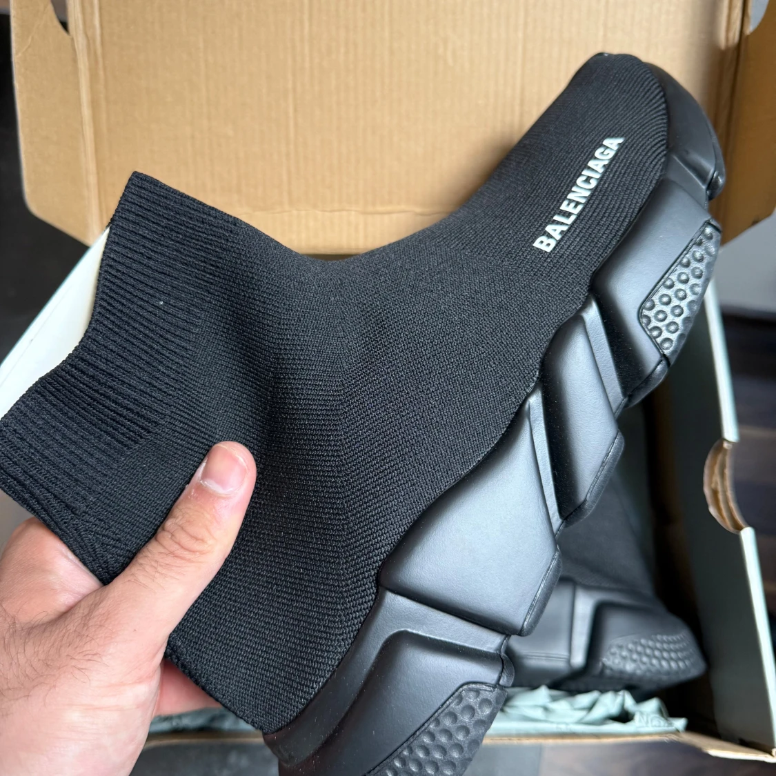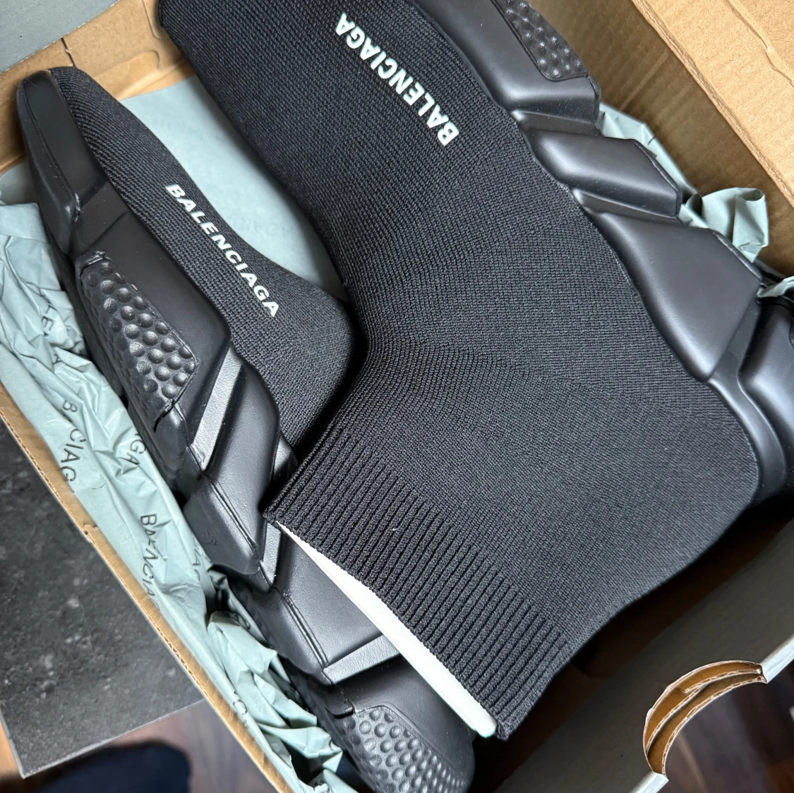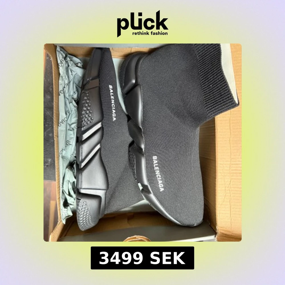 Svarta Balenciaga Speed Trainer sneakers med stickad ovandel i syntet och chunky platt sula. Modellen har en strumpliknande form med ribbad kant och vit Balenciaga-logga på sidan. Snygg futuristisk vibe och riktigt bekväma att bära.