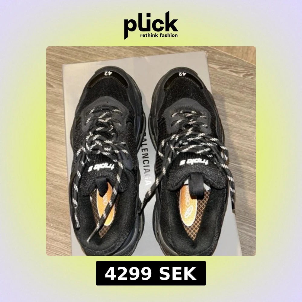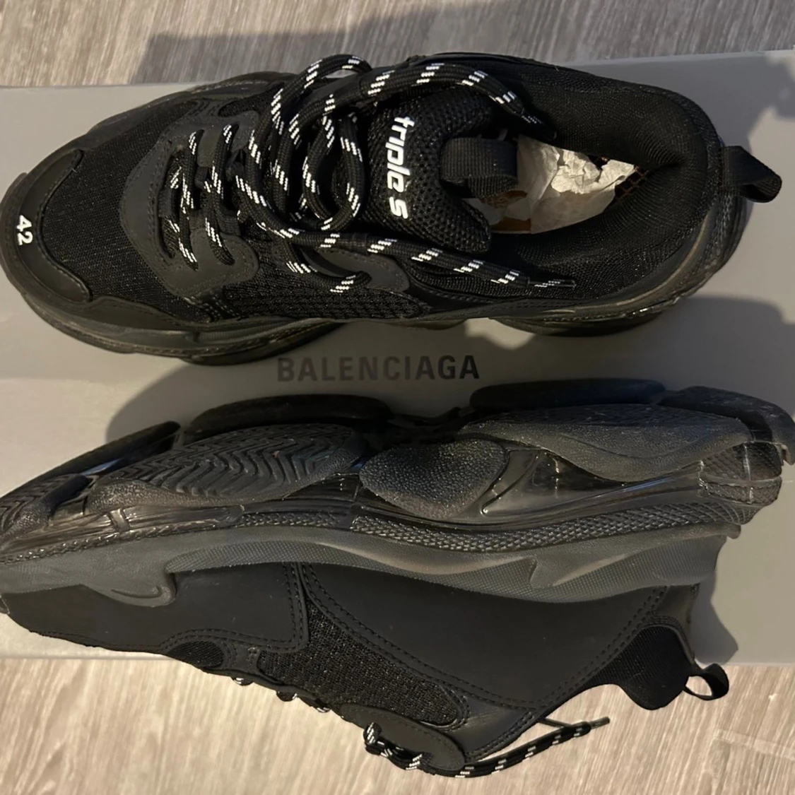 Äkta Balenciaga Triple S sneakers i svart med chunky plattformssula och brokiga snören. Ovandel i mesh och skinn, detaljerad med 'triple s' på tungan och storleken på tån. Snygg och modern siluett som sticker ut, perfekt för dig som gillar statement-skor. Pris kan diskuteras!