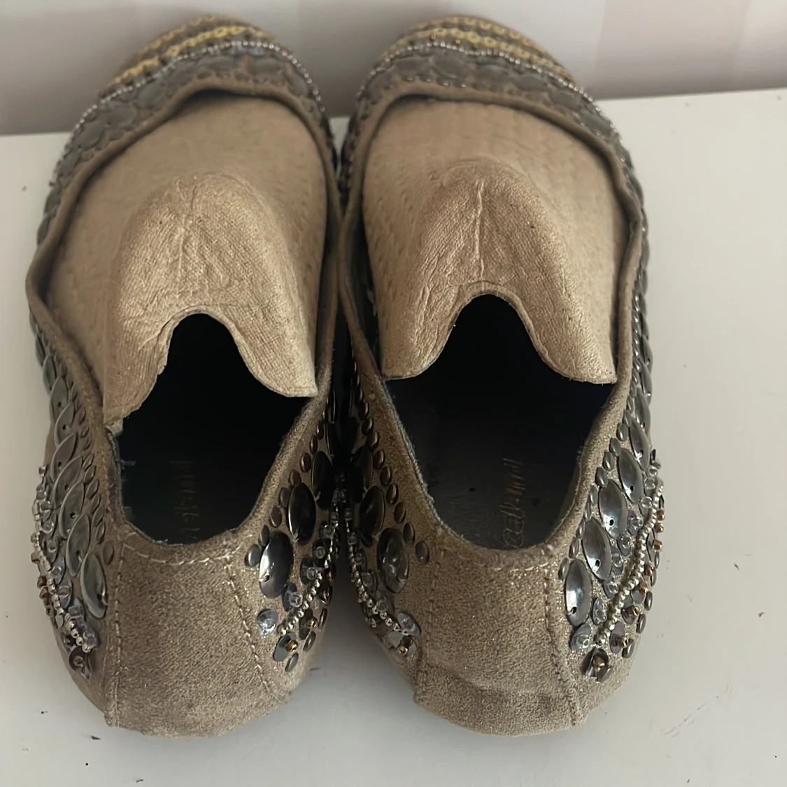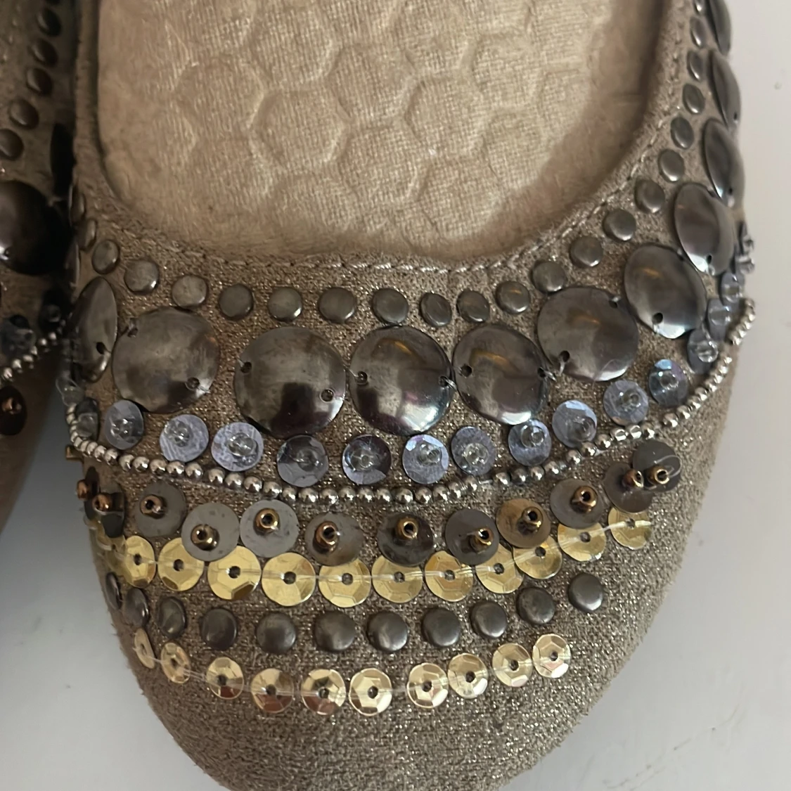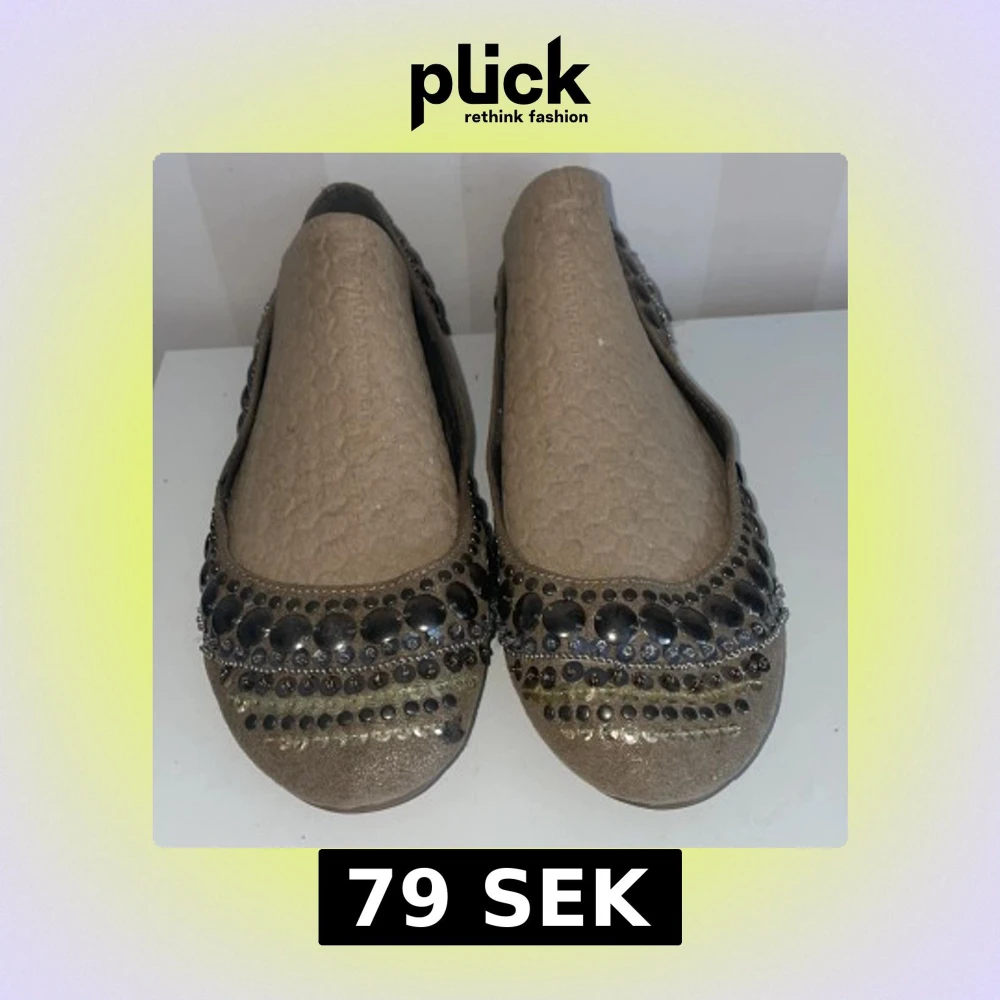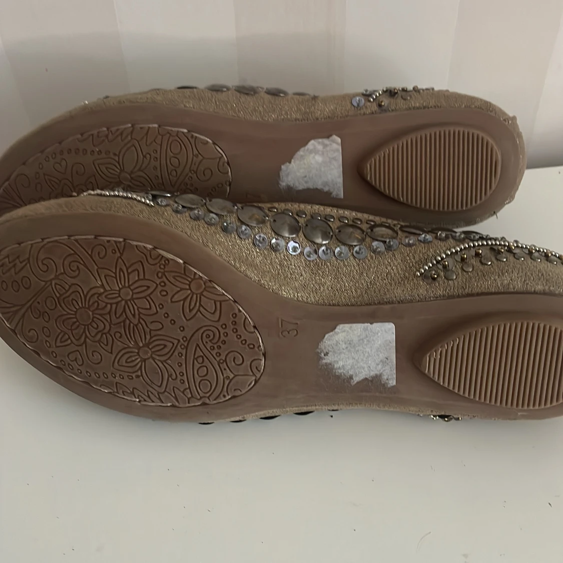 Snygga beige ballerinaskor dekorerade med glittrande paljetter och stenar , nya, pga förvar läder inuti släppt, inget som syns eller märks när man har de på.Perfekta för att ge en touch av glamour till din outfit. Skorna har en rund tå och en bekväm passform.