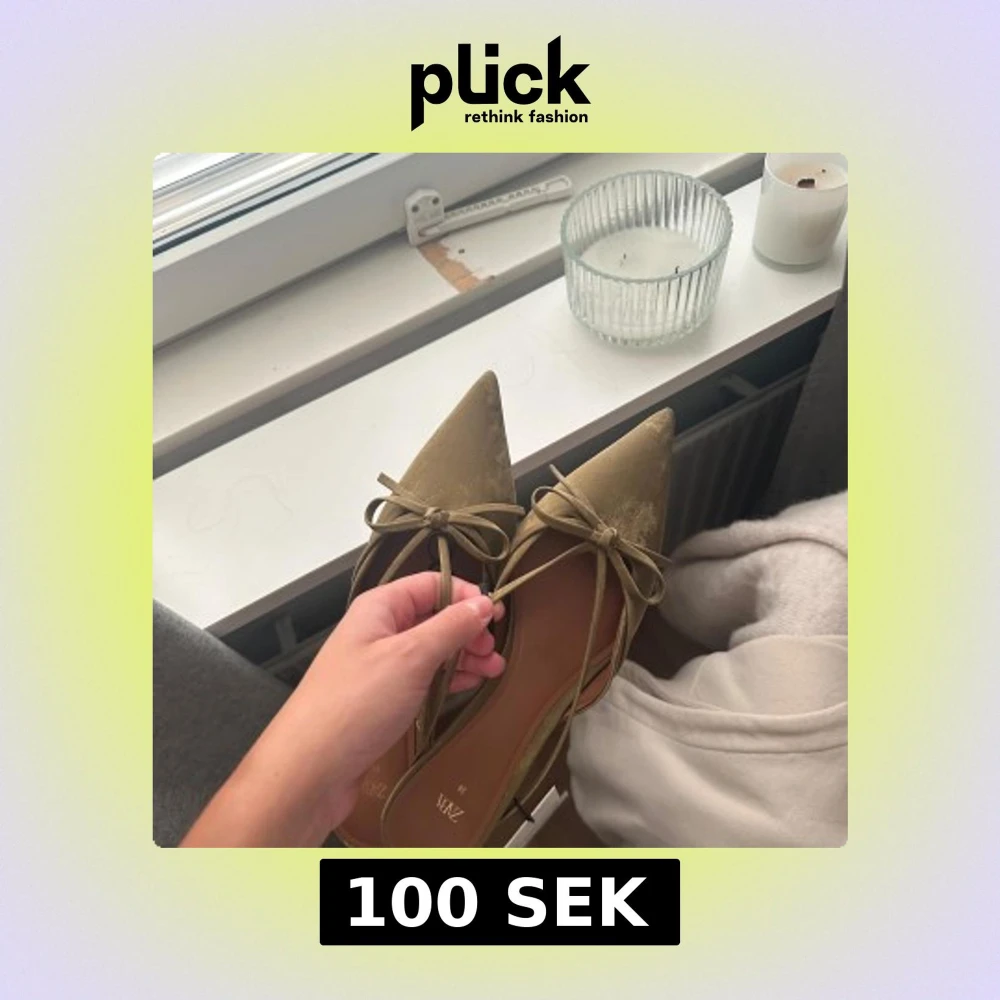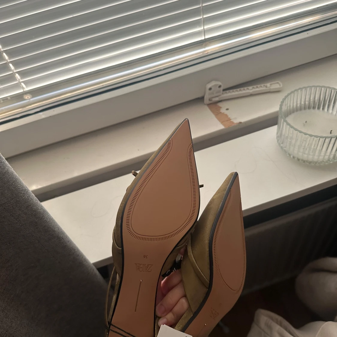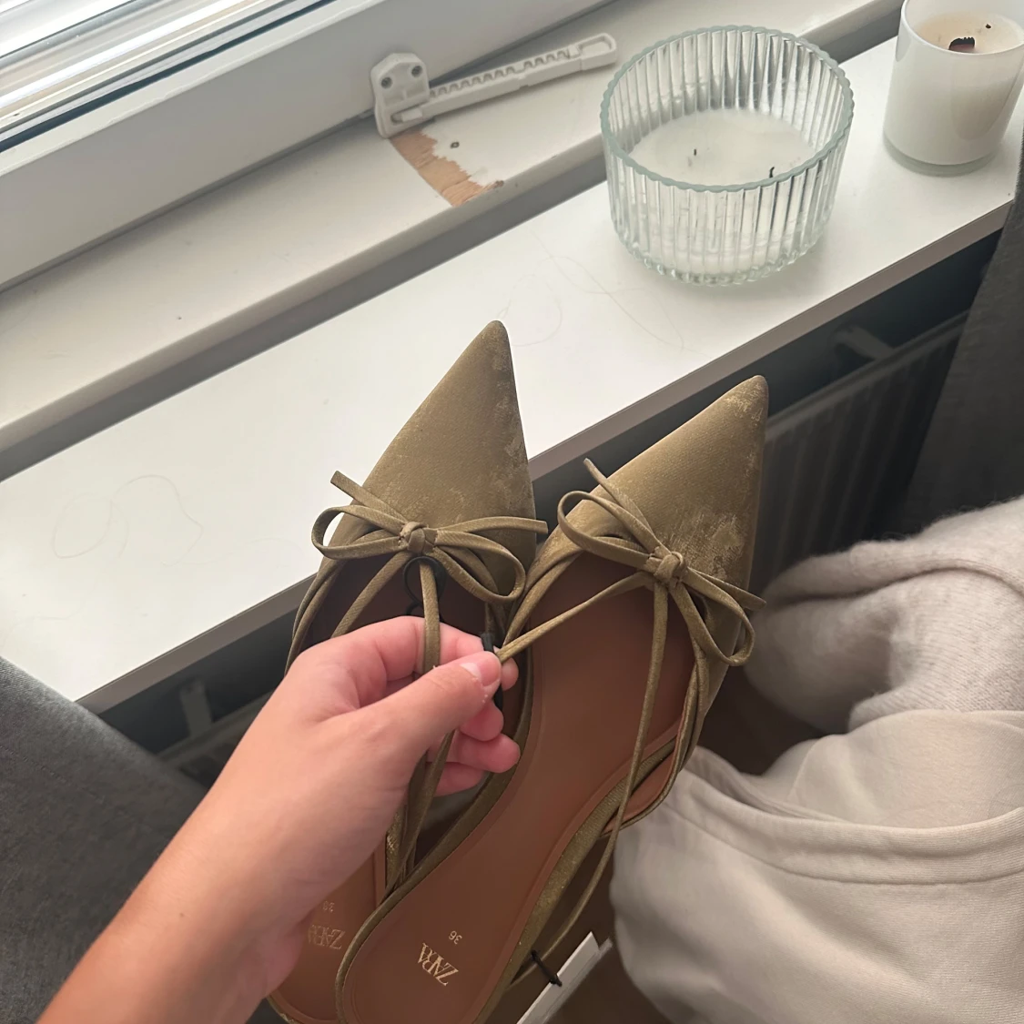 Snygga olivgröna pumps från Zara i mocka med spetsig tå och låg klack. Skorna har fina rosettdetaljer framtill och smala remmar som ger en elegant look. Perfekta för dig som vill sticka ut med stilrena detaljer och trendig färg.