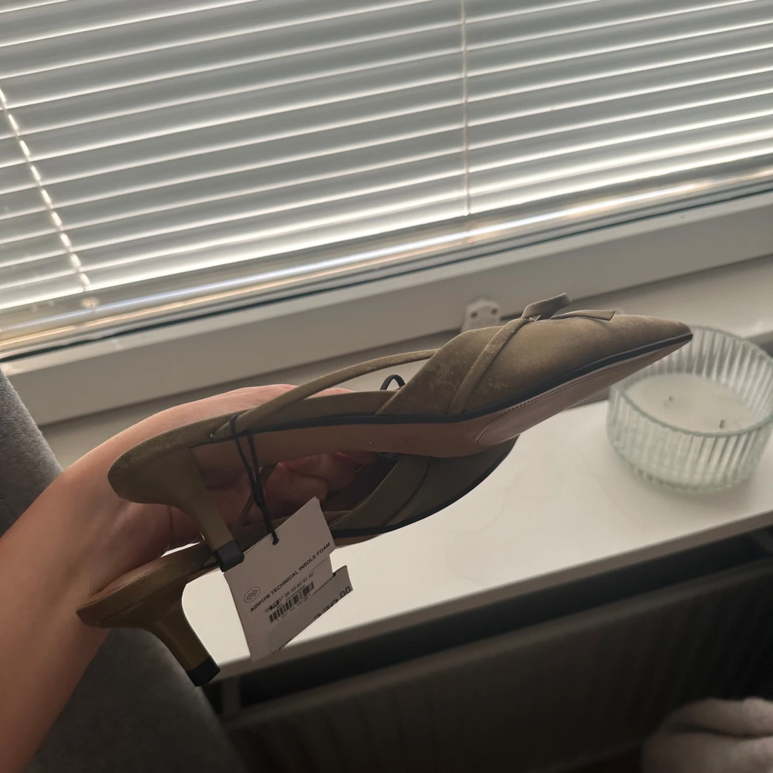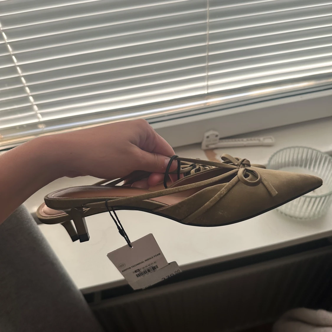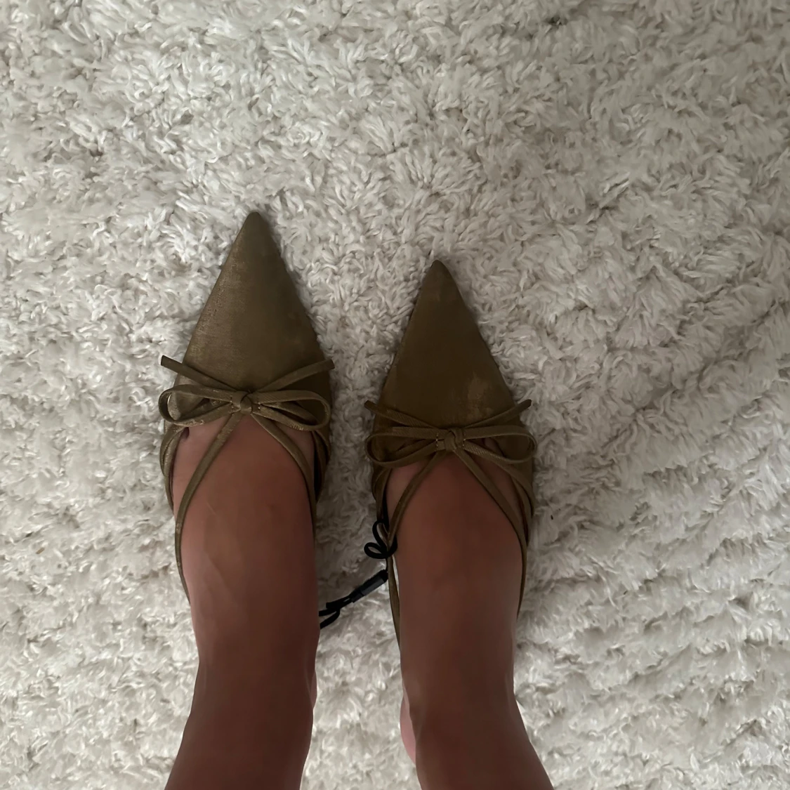Snygga olivgröna pumps från Zara i mocka med spetsig tå och låg klack. Skorna har fina rosettdetaljer framtill och smala remmar som ger en elegant look. Perfekta för dig som vill sticka ut med stilrena detaljer och trendig färg.