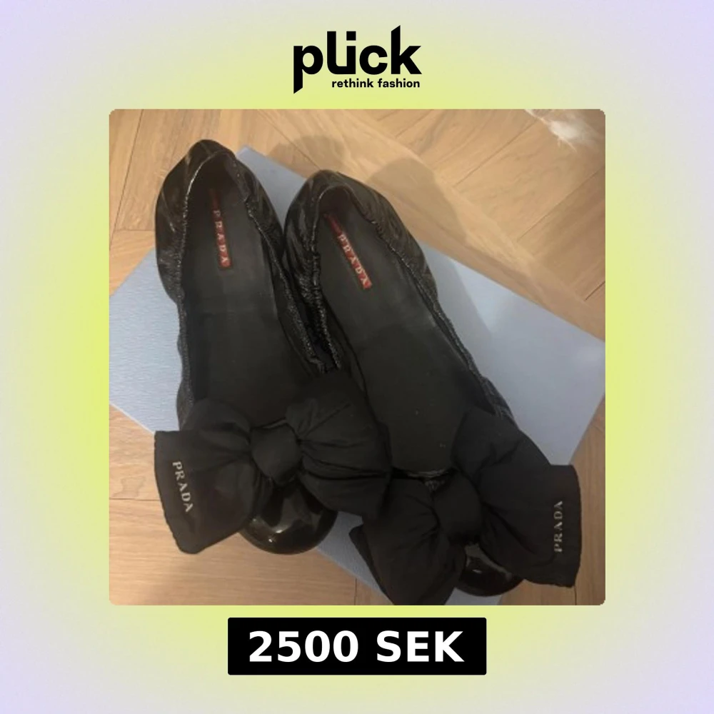 Snygga svarta ballerinaskor från Prada med en stor rosett framtill. Skorna har en rund tå och är tillverkade i ett glansigt material som ger en elegant touch. Perfekta för att lägga till en stilfull detalj till din outfit.