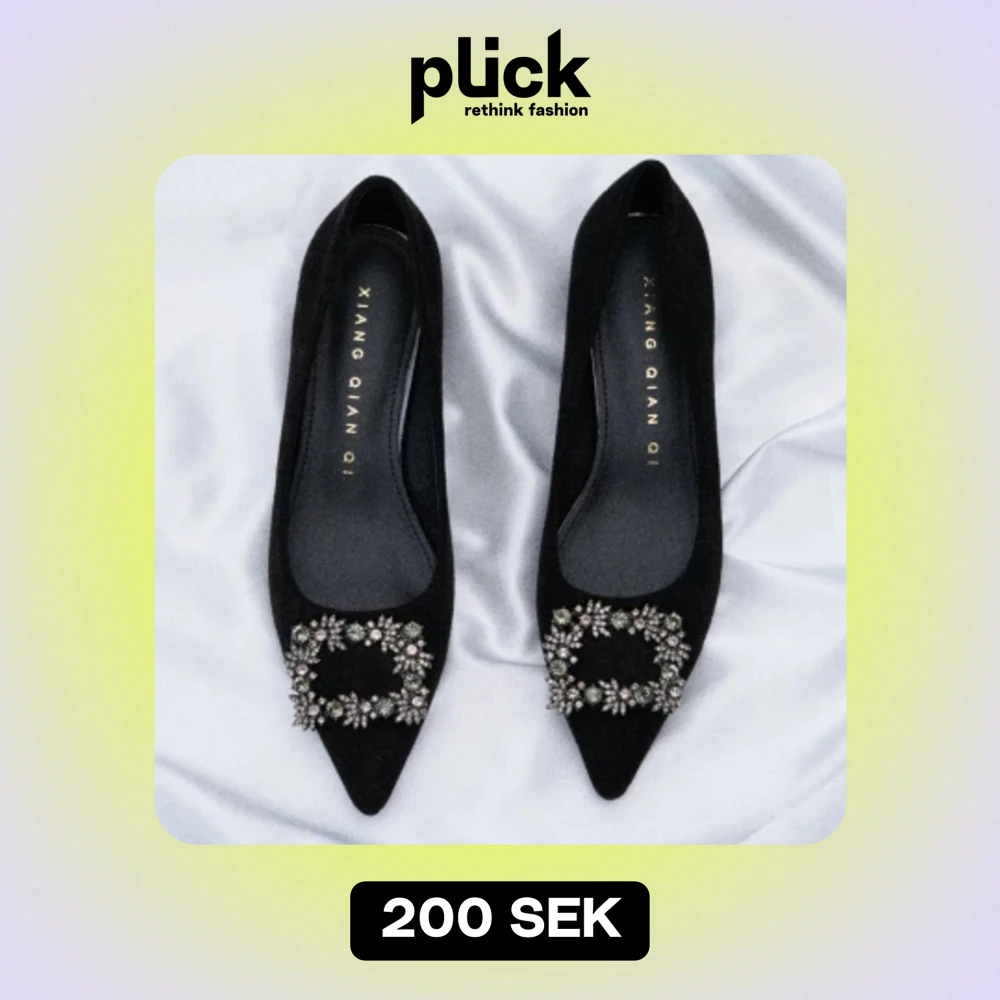 Eleganta svarta ballerina skor med spetsig tå och strass detaljer. Helt nya och aldrig använda, säljer då skorna tyvärr är för stora för mig. Produktmått: Fotomkrets: 21,5 cm Fotlängd: 23,5 cm och klacken är 3 cm hög.