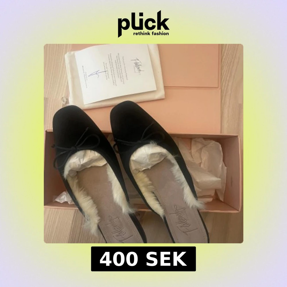 Säljer ett par svarta ballerinaskor från Flattered med mjuk fuskpäls på insidan och rosett framtill. Skorna har rund tå och är tillverkade i mocka, ”pälsen” inuti syns inte när skorna är på.
