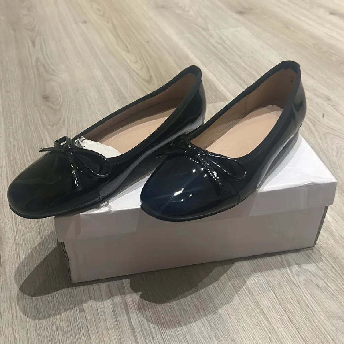 Snygga svarta ballerinaskor i lack med en söt rosett på tån. Perfekta för en stilren look och bekväma att bära hela dagen.