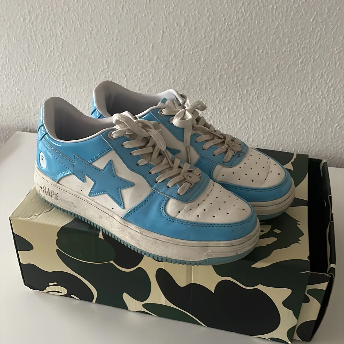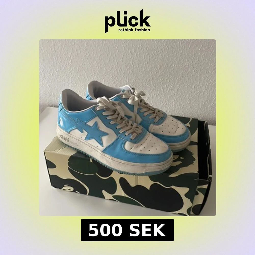 Bape ljusblå skor till ett bra pris, använda ganska mycket men endå i ok skick därav priset.