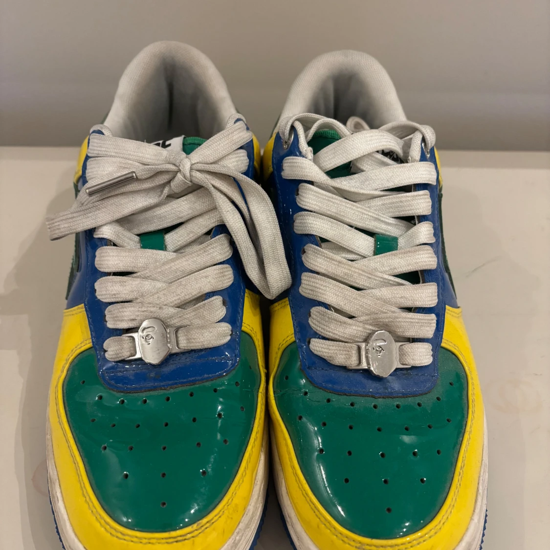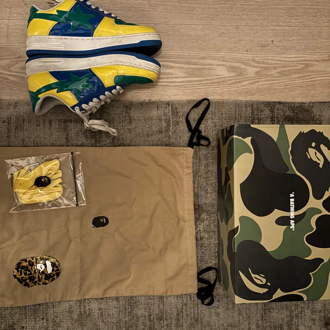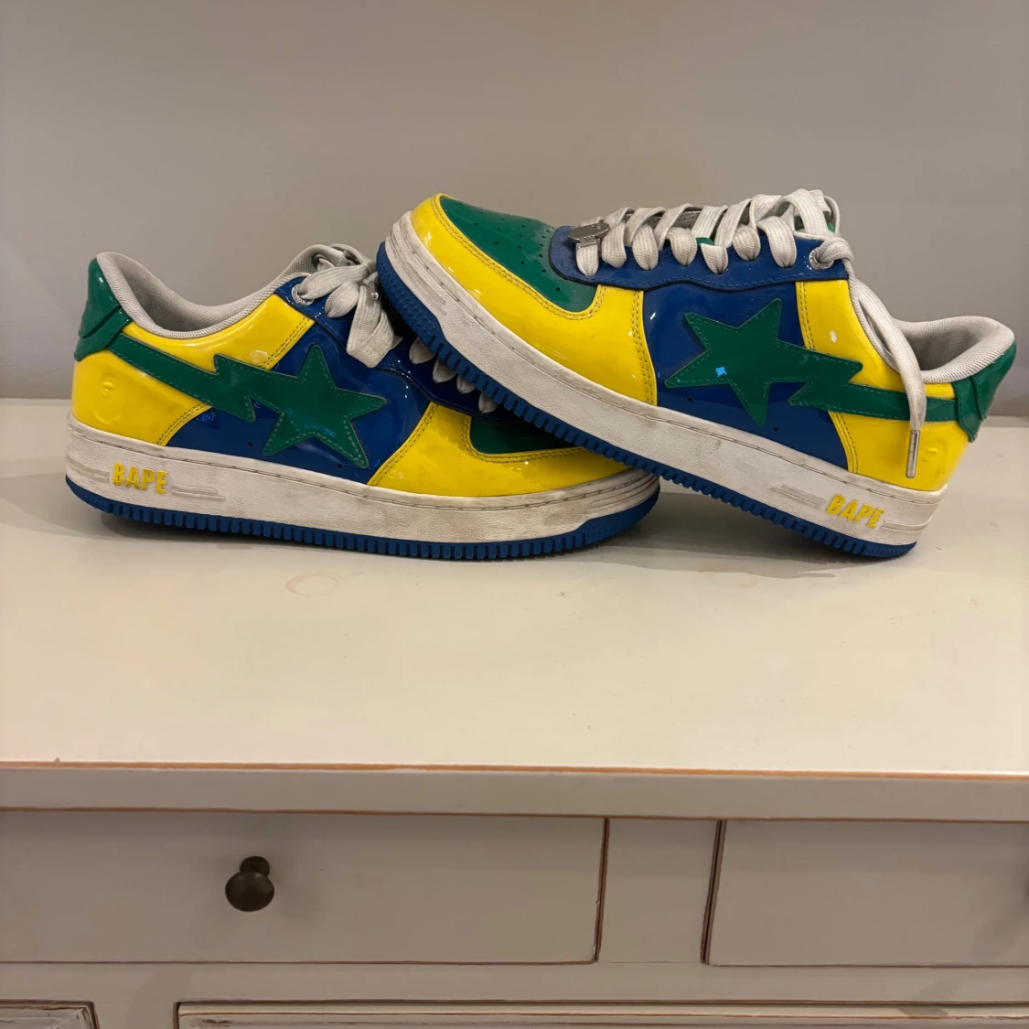 Snygga och unika sneakers från Bape i en färgglad kombination av blått, gult och grönt. Skorna har en stjärndetalj på sidan och vita snören. Perfekta för dig som vill sticka ut med din stil. Dessa är i storlek 42 och har använts kanske 5-6 gånger. Allt ingår vid köp stickers, extra laces, dustbag samt låda. Dessa är äkta, köpa på bape butiken i Paris. Skicka dm vid intresse!