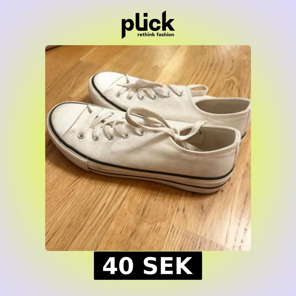 Klassiska vita tyg sneakers med lågt skaft, rund tå och snörning.