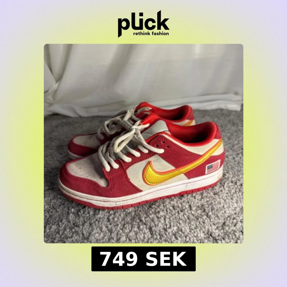 Dessa röda Nike Dunks är en unik mix av stil och uttryck, med ett amerikanskt flaggmotiv och en gul Nike Swoosh-logo. Perfekta för den som vill ha ett par sneakers som både sticker ut och ger ett sportigt intryck. Bekväma, slitstarka och med en design som gör dem till ett statement. Storlek 38.5, i bra skick.