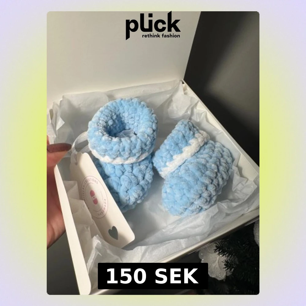 Supersöta handgjorda baby tofflor i ljusblått och vitt, virkade i ett super mjukt garn. Skorna har en rund form och är riktigt gosiga för de minsta. Virkade av mig. Storlek 0-3 månader. Garnet är certifierat med OEKO-TEX® standard 100 produktklass 1. Produktklass 1 är högsta klass och gäller t ex textilier och leksaker tillverkade för spädbarn och småbarn.