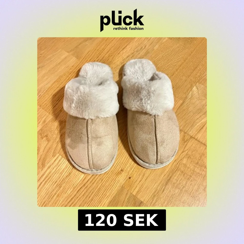 Uggliknande beiga tofflor med supermjuk ljus fuskpäls runt hela insidan och kanten. Ovandelen är i mockaliknande material och sulan är platt. Står på tofflan att det är storlek 38-39 men det är mer som en 37, därför säljs dem.