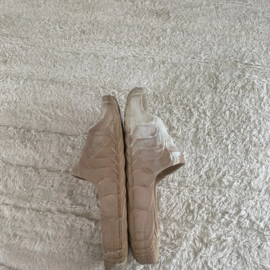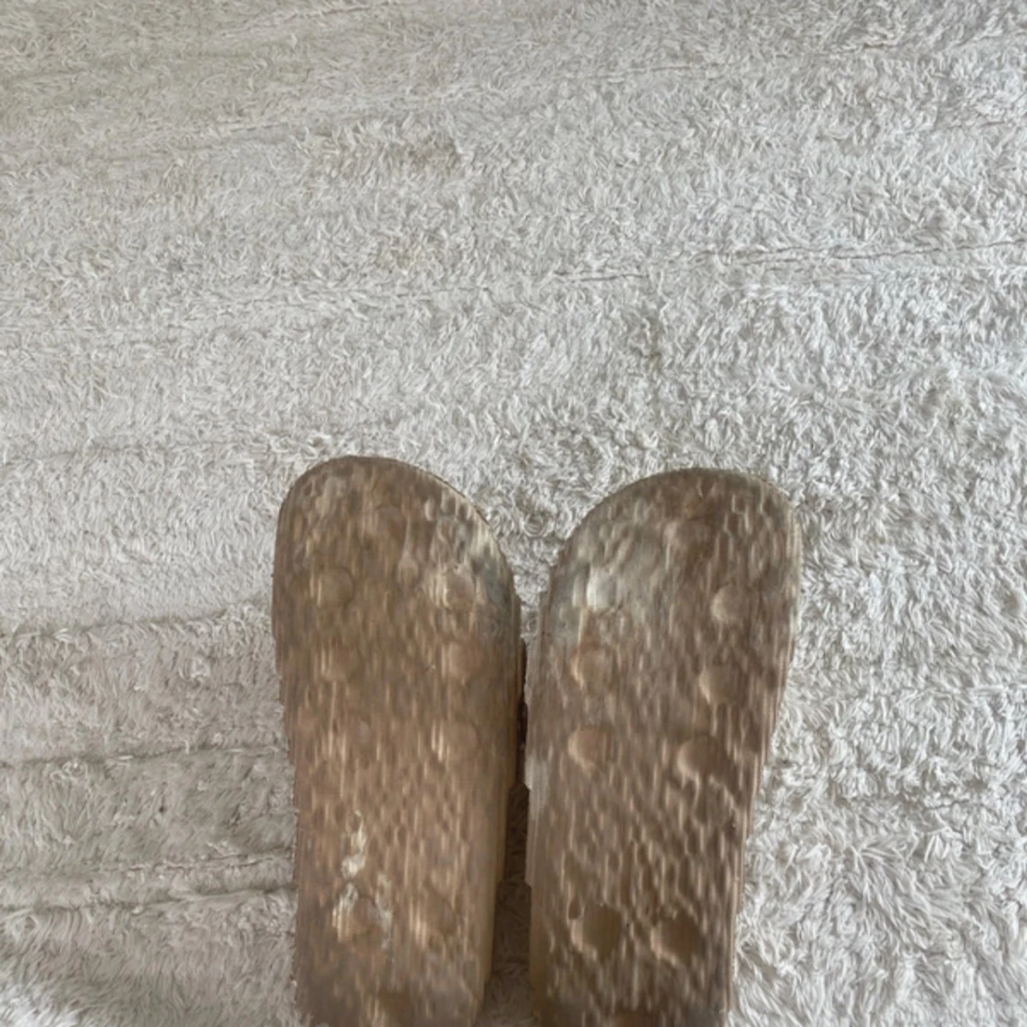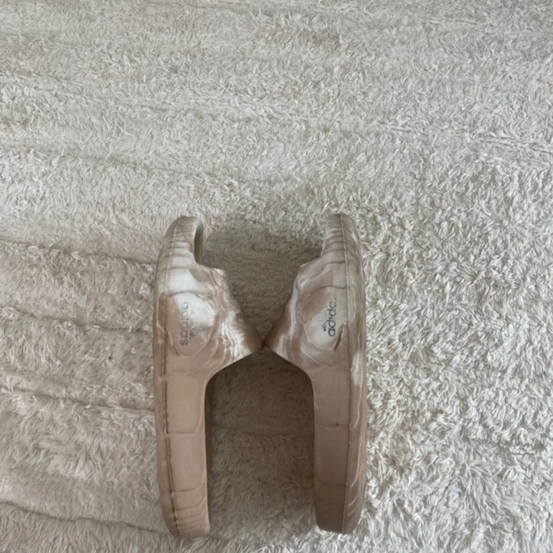 Säljer ett par beige Adidas Adilette sandaler med vit marmorering. De har en chunky sula och ribbad ovandel för extra komfort. Perfekta för sommaren och chill dagar. Adidas-logga på sidan. Tillverkade i syntetmaterial.