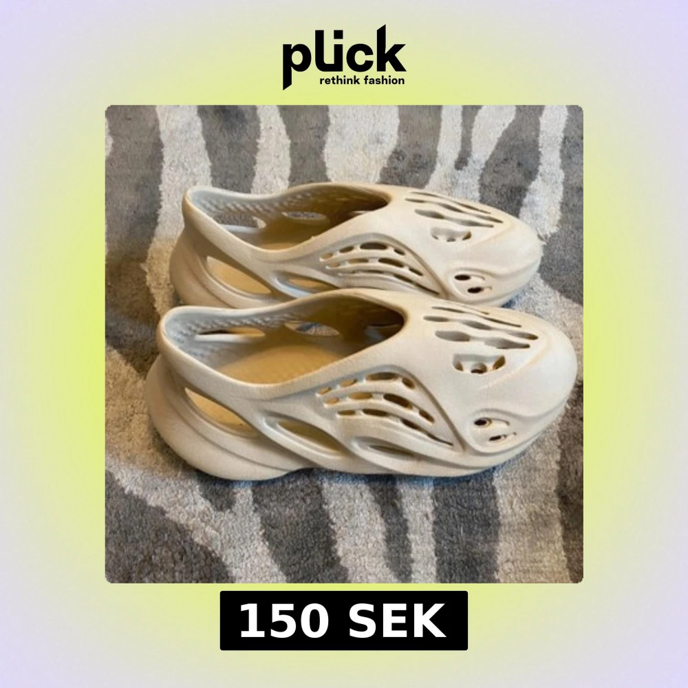 Säljer ett par beige adidas Yeezy Foam Runner med futuristisk design och massor av hål för extra ventilation. Skorna är tillverkade i lätt syntetmaterial och har en chunky, rundad sula. Perfekta för dig som vill sticka ut med en unik och bekväm look.