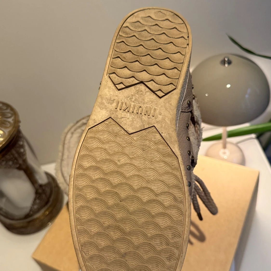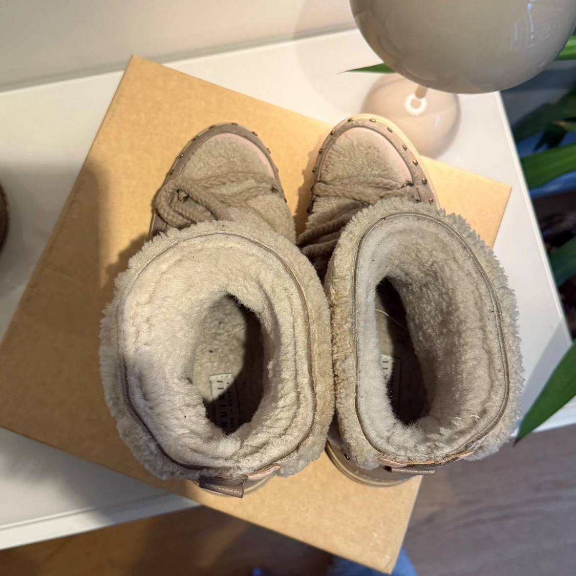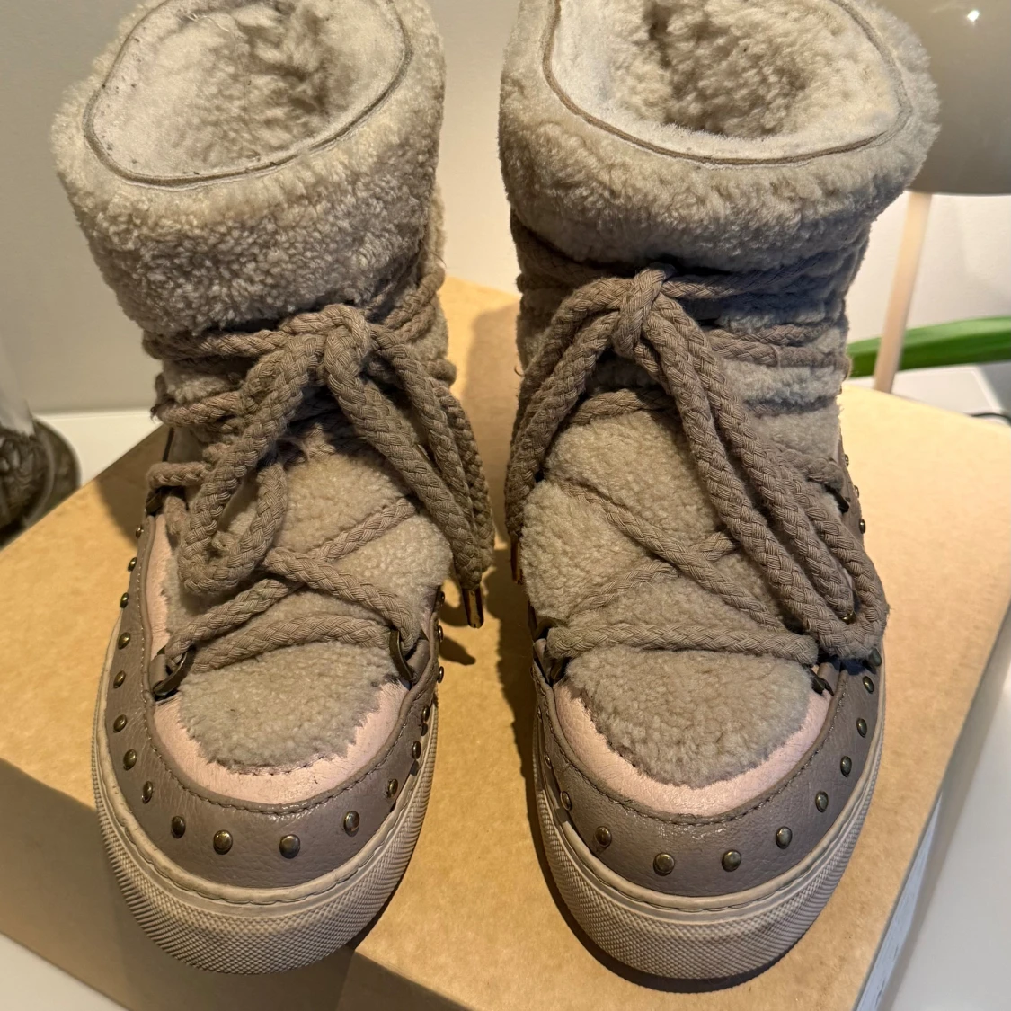 Säljer ett par beige boots från INUIKII med mjuk pälsimitation och grov snörning runt hela skon. Yttermaterialet är mocka och skinn, dekorerat med små runda nitar längs kanten. Perfekta för kalla dagar med sin fluffiga insida och platta sula. Modellen heter curly rock. Köpta förra året för 3999kr men sparsamt använda så fint skick.