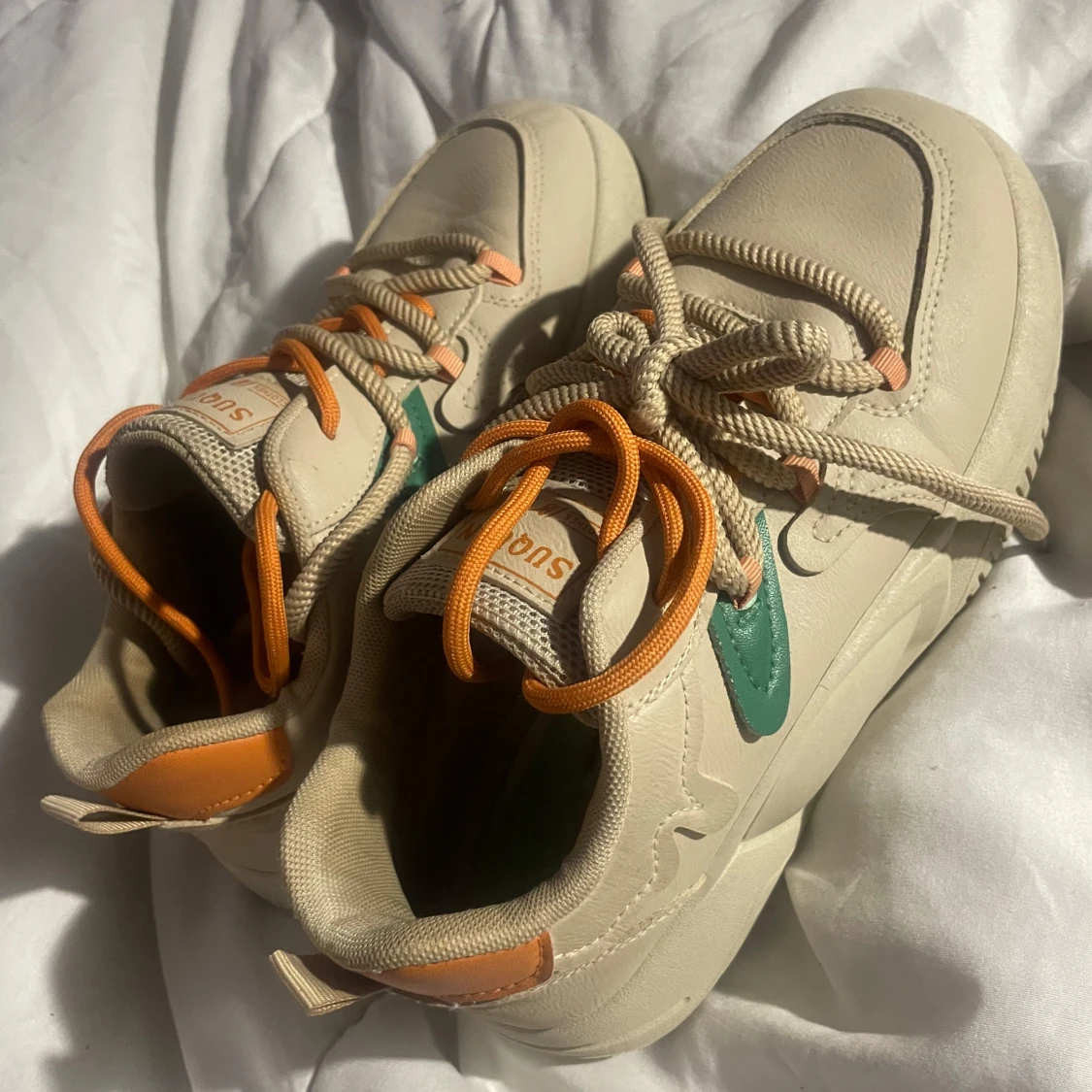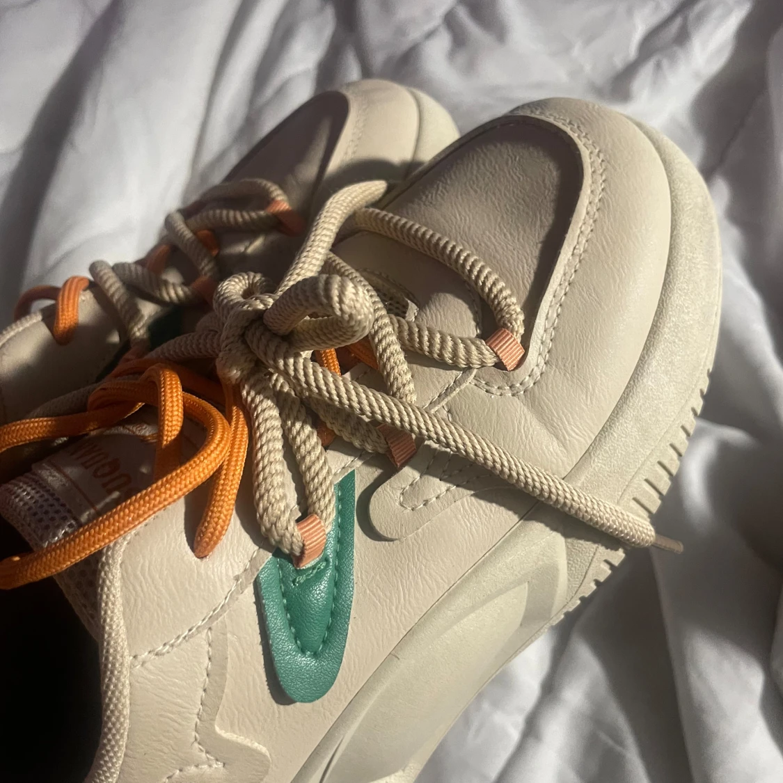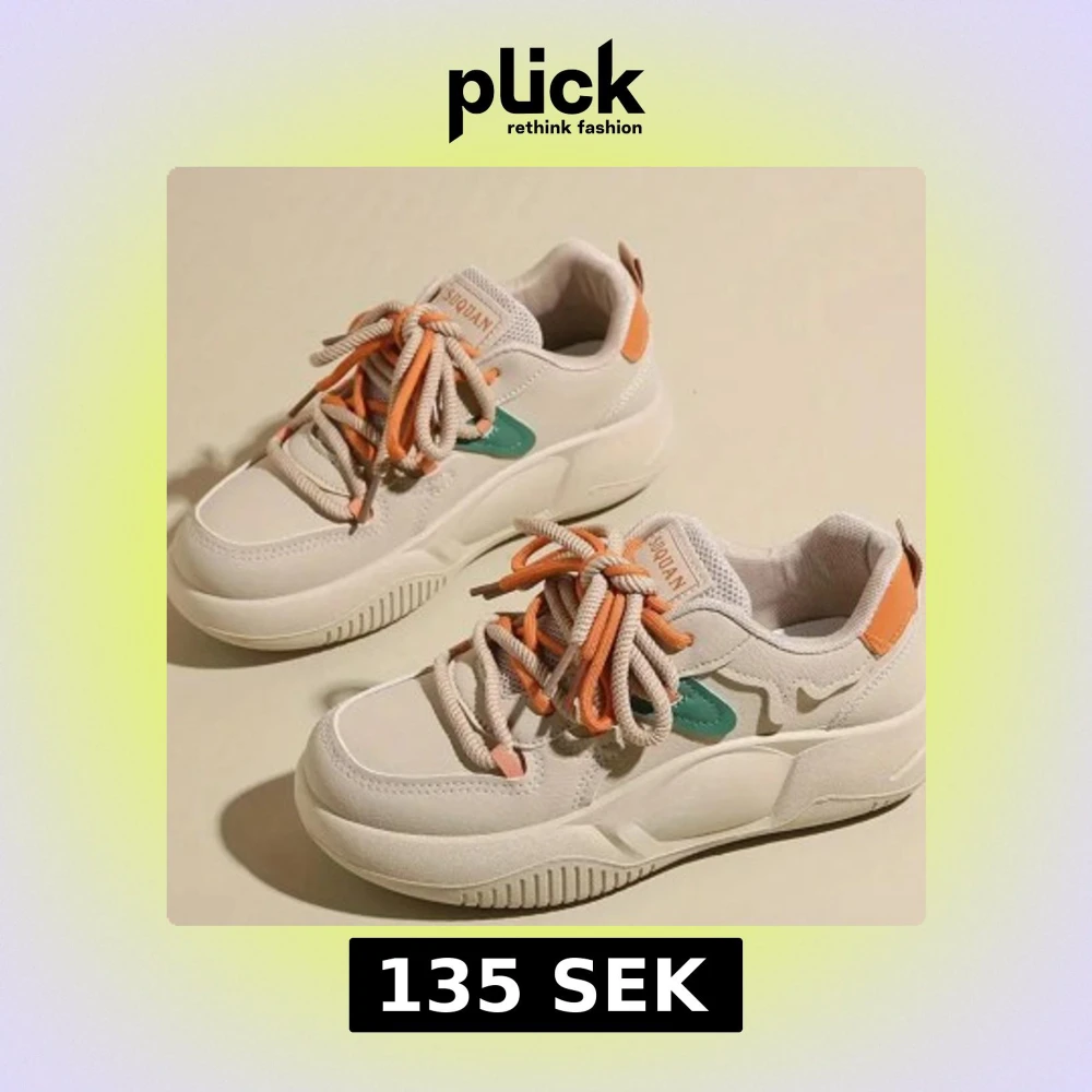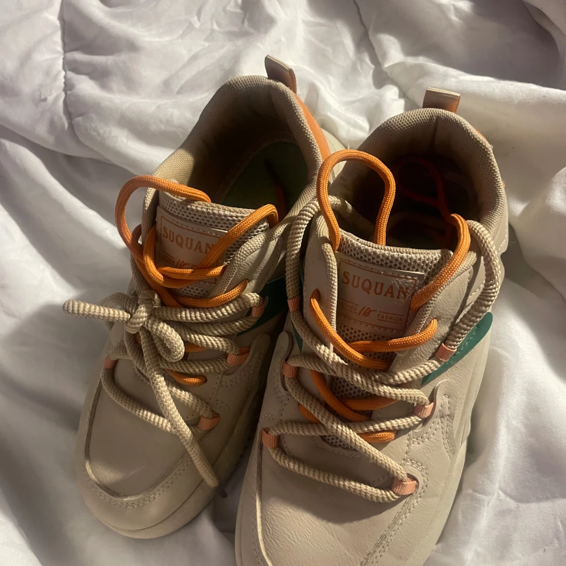 Chunky sneakers från Suquan i beige syntetmaterial med gröna och orange detaljer. Skorna har tjock sula, rund tå och snörning med tvåfärgade skosnören i beige och orange. Perfekta för dig som gillar en sportig och trendig look.