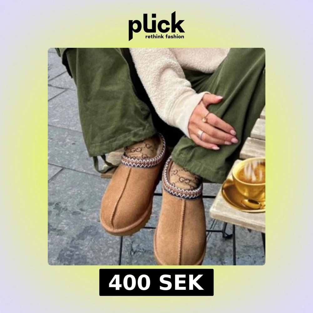 Mysiga beige tofflor från UGG med mjukt vitt foder och dekorativt mönster runt öppningen. Yttermaterialet är mocka och sulan är i gummi, perfekt för att hålla fötterna varma hemma.