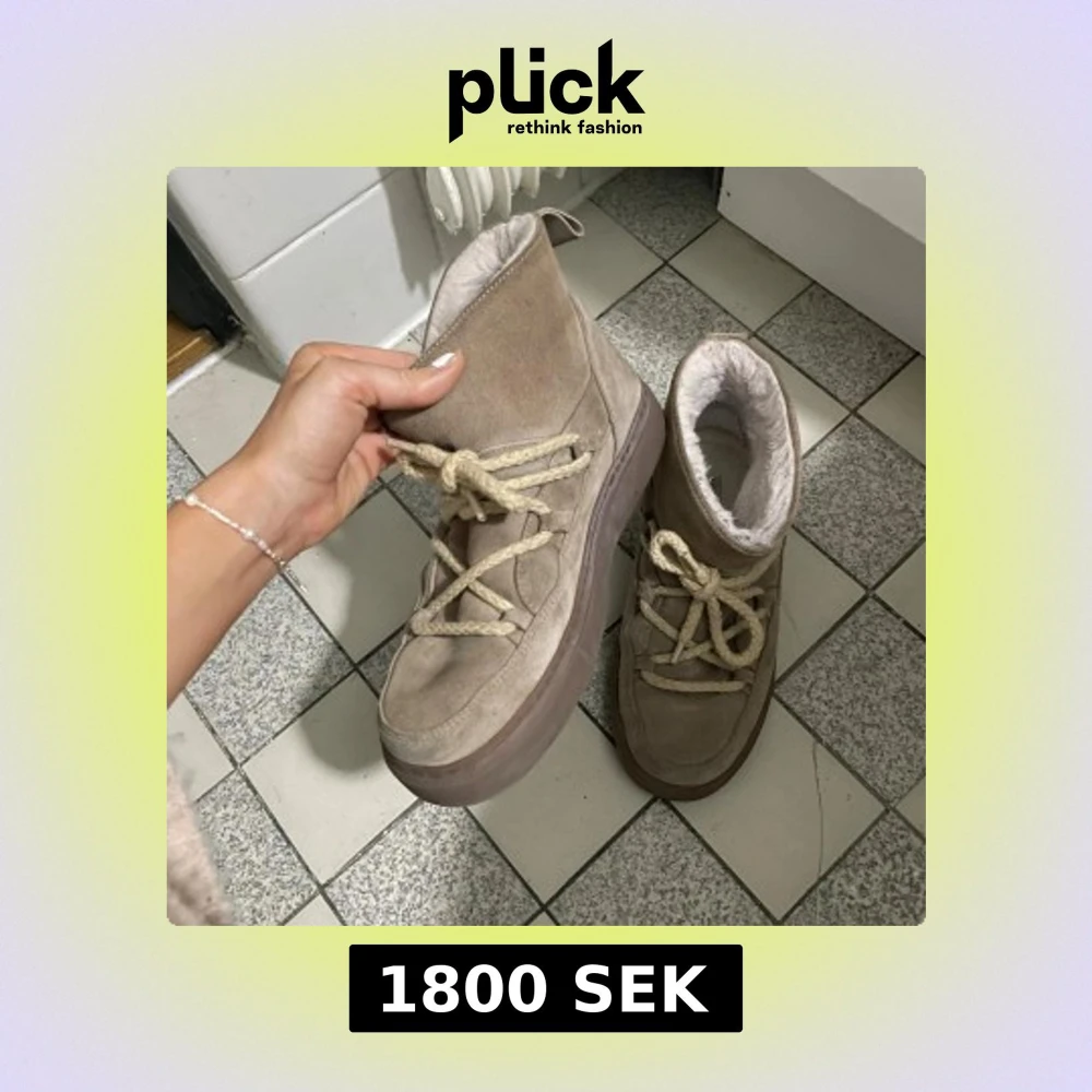 Säljer ett par beige boots från Inuikii med grov snörning och platt brun sula. Utsidan är i mjuk mocka och insidan är fodrad med fluffigt material för extra värme. Skorna har rund tå och en snygg detalj med logotypen broderad bak. Obs!! endast använda en halv vinter och jag har tagit av metallgrejen