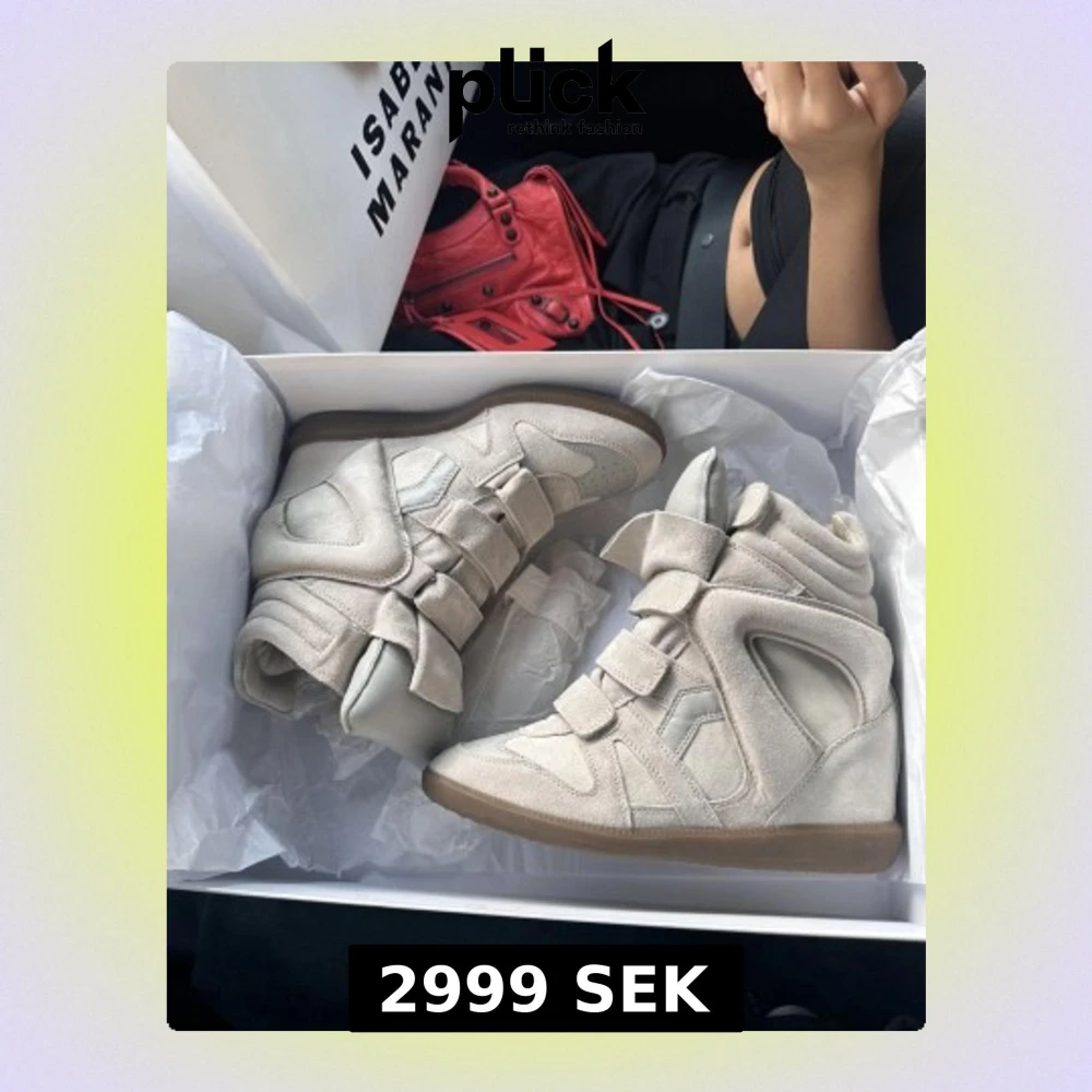 Säljer ett par beige höga sneakers från Isabel Marant med plattformssula och rund tå. Skorna har flera kardborreband och är tillverkade i mjuk mocka med detaljer i skinn. Snygg chunky siluett som ger extra edge till din outfit.