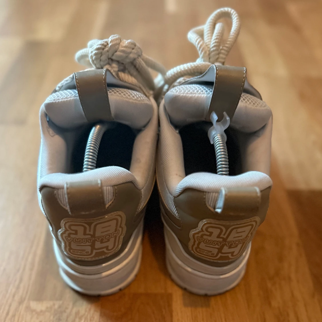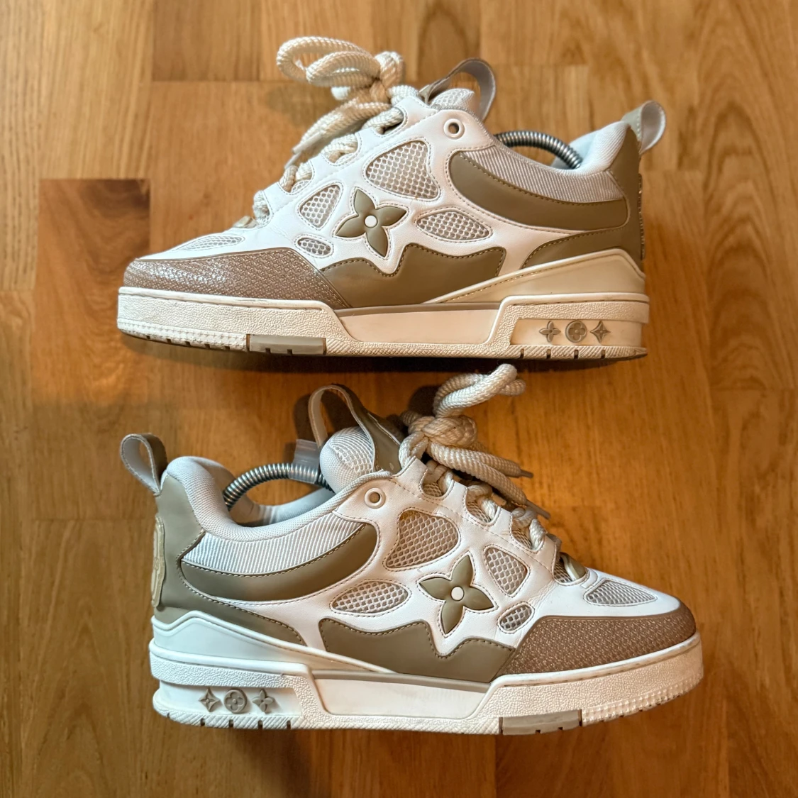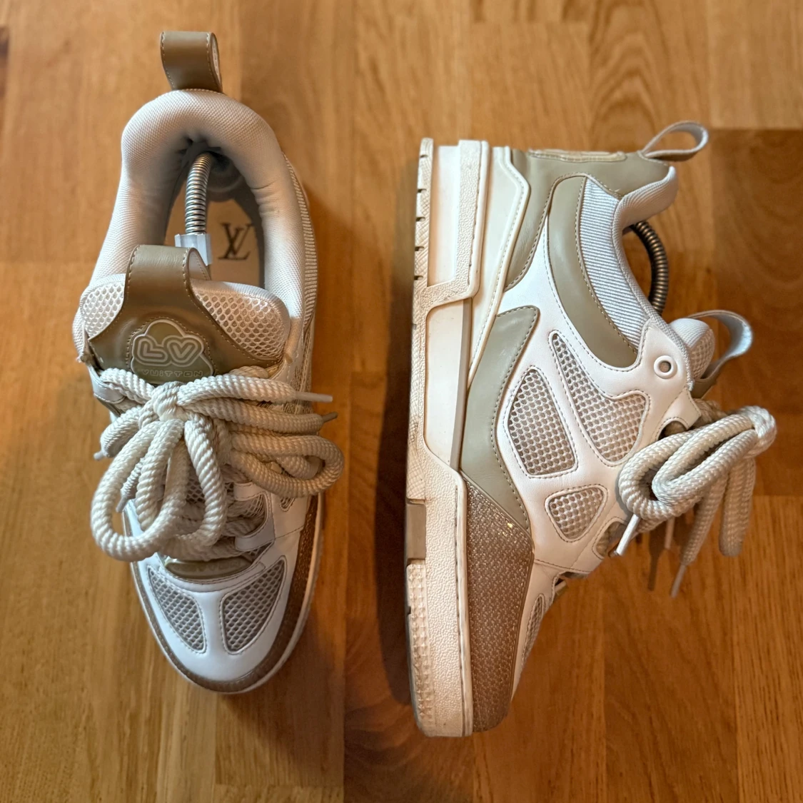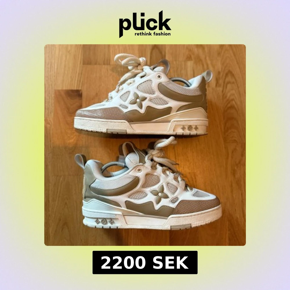 Snygga Louis Vuitton sneakers i beige och vitt med LV-logga och blommig detalj på sidan. Skorna har chunky sula, meshpaneler och skinnpartier samt grova snören. De är i storlek 41. Skorna är använda men är fortfarande i bra skick. Box och dustbags följer med. Perfekta för dig som gillar exklusiva och trendiga sneakers med streetkänsla. Pris kan diskuteras