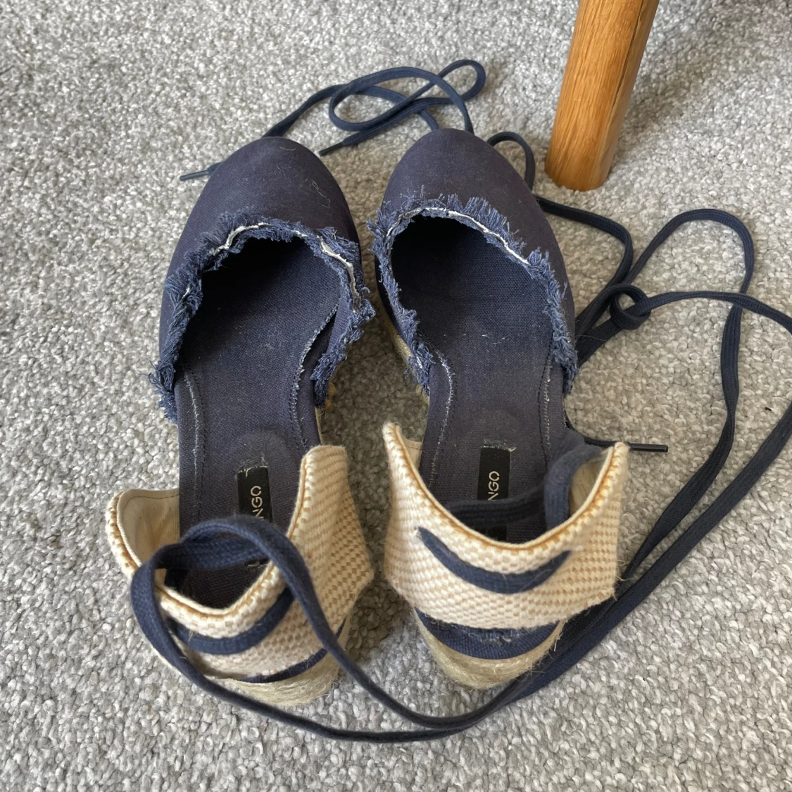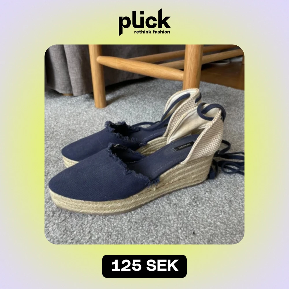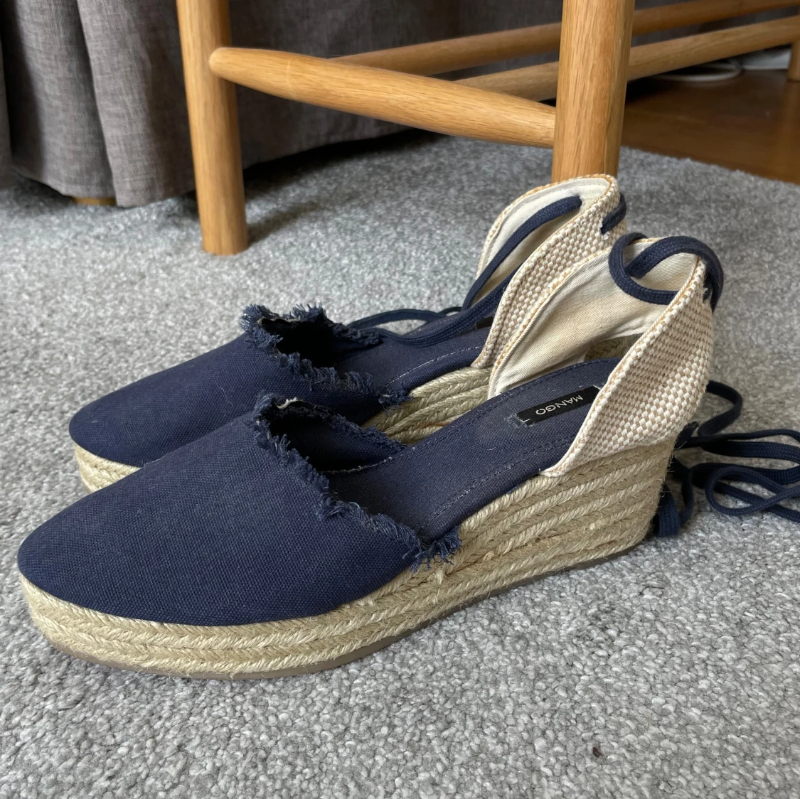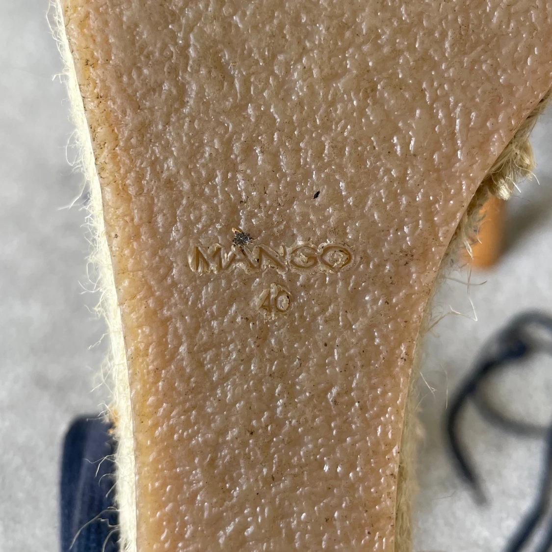 Säljer ett par snygga blå kilklackssandaler från Mango i storlek 40.