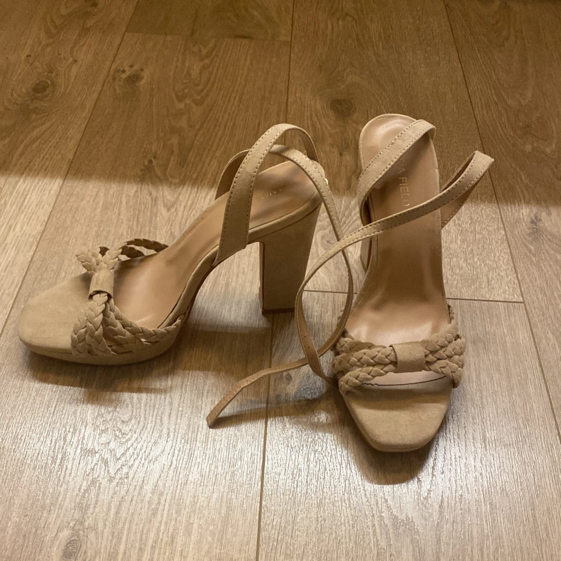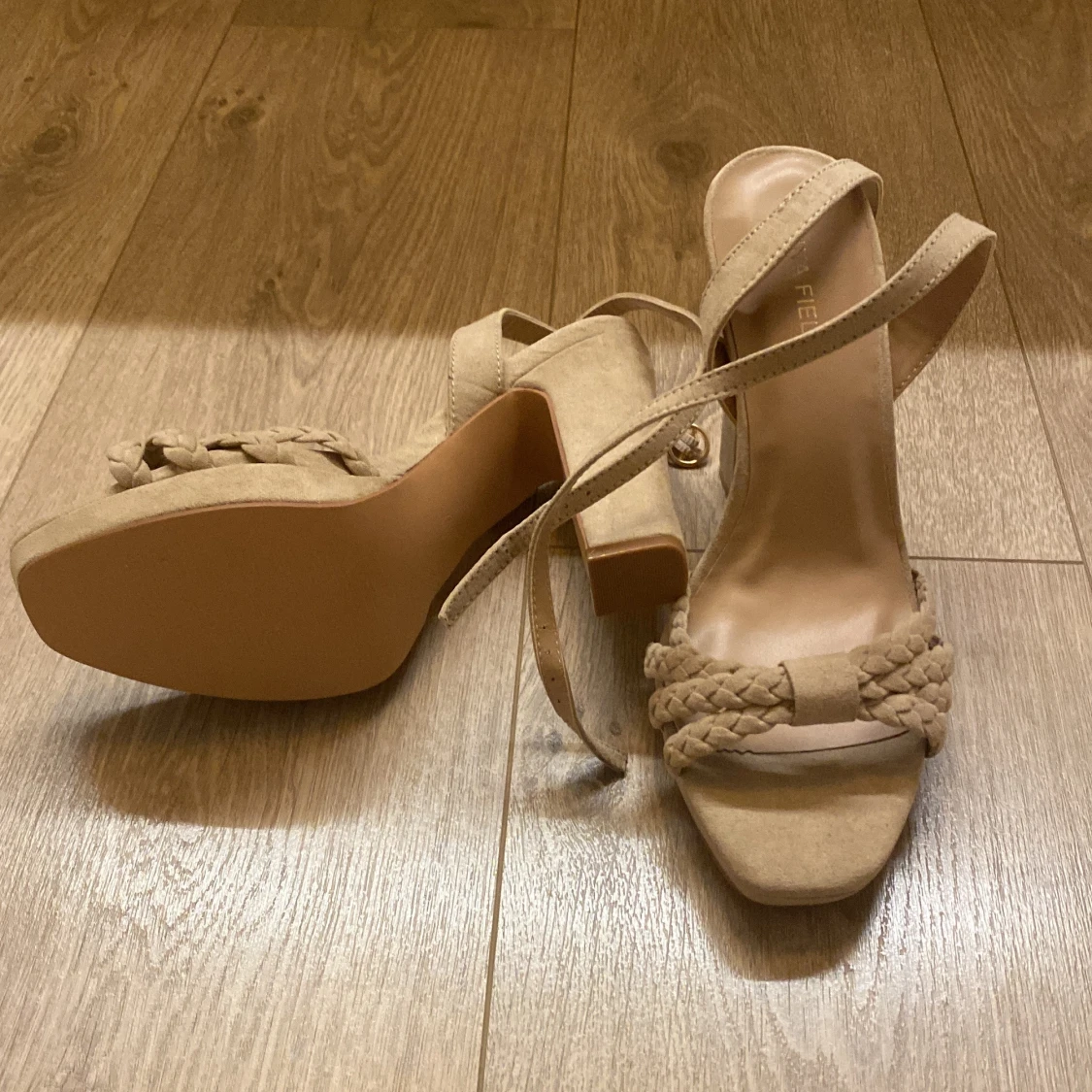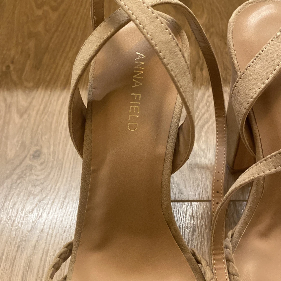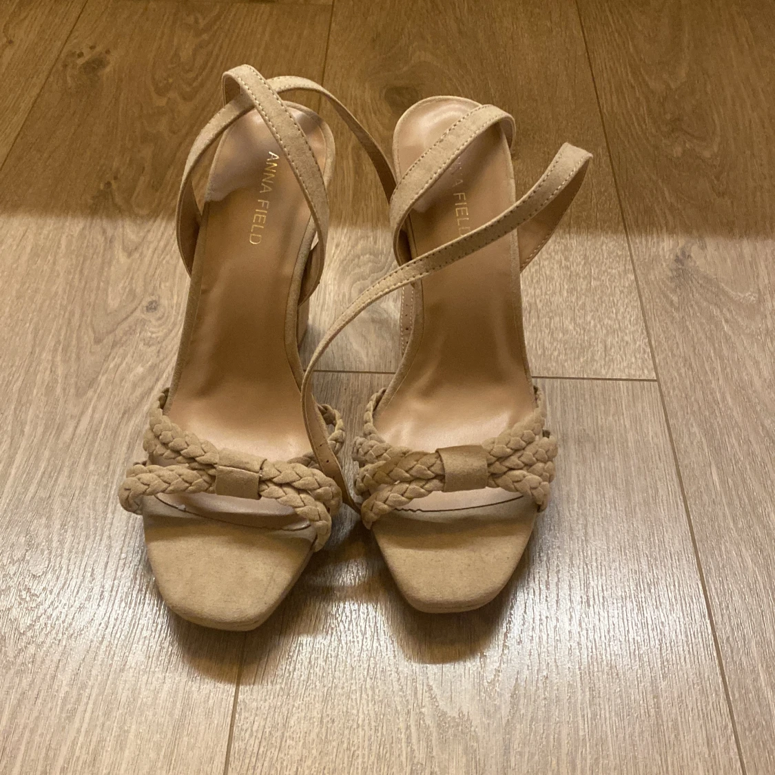 Snygga sandaler från Anna Field i beige mocka med flätad rem över tårna och smala remmar som går runt fotleden. Skorna har hög blockklack och öppen tå med en modern fyrkantig form. Perfekta för dig som vill ha en chic och trendig look.
