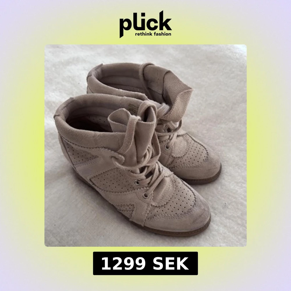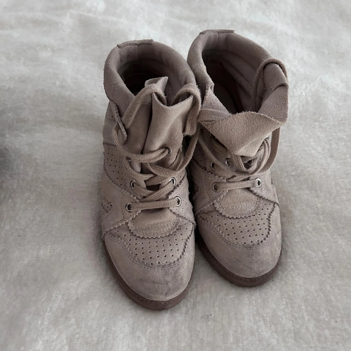 Säljer ett par knappt använda höga beige sneakers i mocka med snygga perforerade detaljer och snörning framtill. Skorna har en rund tå och platt sula, vilket gör dem både stilrena och bekväma. Perfekt för dig som gillar en clean och soft look. Knappt använda max 3 gånger!