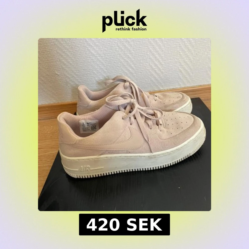 Säljer ett par stilrena beige Nike sneakers med snörning och lite högre sula. Skorna har en klassisk design med en vit sula och är perfekta för en avslappnad look.