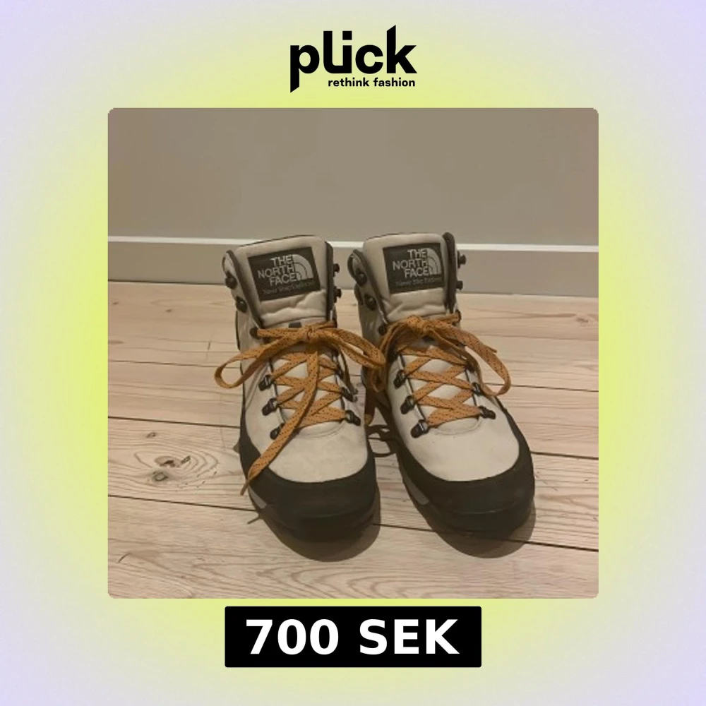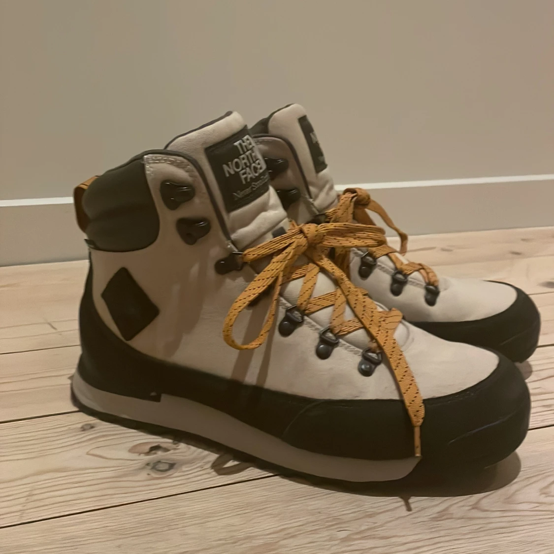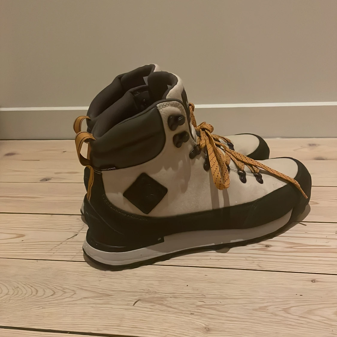 Säljer ett par robusta kängor från The North Face i beige och svart. Skorna har snörning och är perfekta för utomhusaktiviteter. De är tillverkade i slitstarkt material och har en bekväm passform. Anbända enstaka gånger så har lite tecken på användning nypris ligger på 1000kr