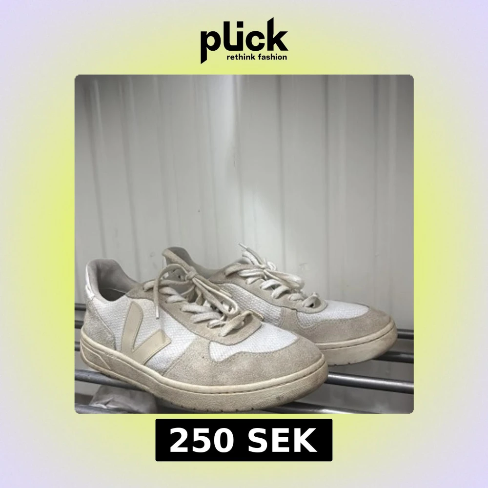 Snygga sneakers från Veja i beige och vitt med klassisk V-logga på sidan. Skorna har rund tå, platt sula och snörning. Säljs då jag ej använder längre, syndligt använda men inga större defekter.