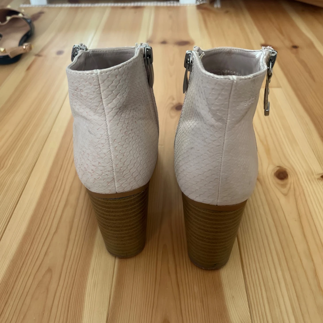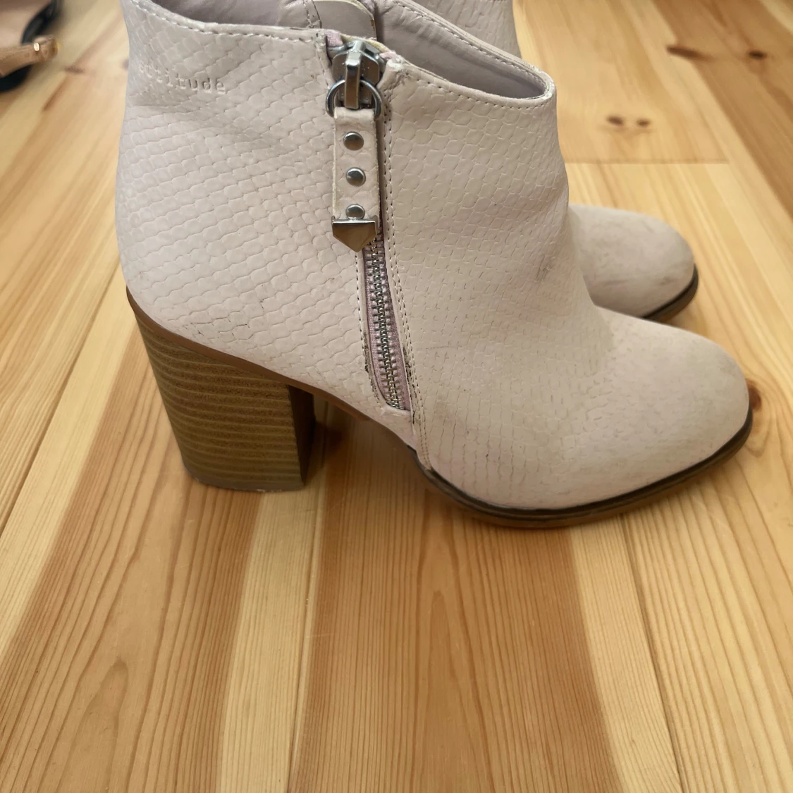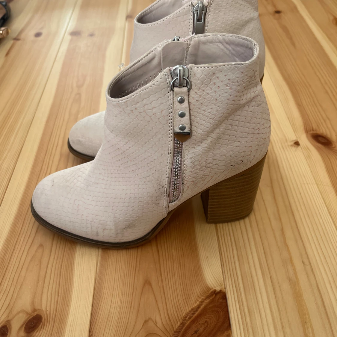 Snygga beige/rosa boots med ormskinnsmönstrad yta, grov klack och dragkedja på sidan. Skorna har rund tå.