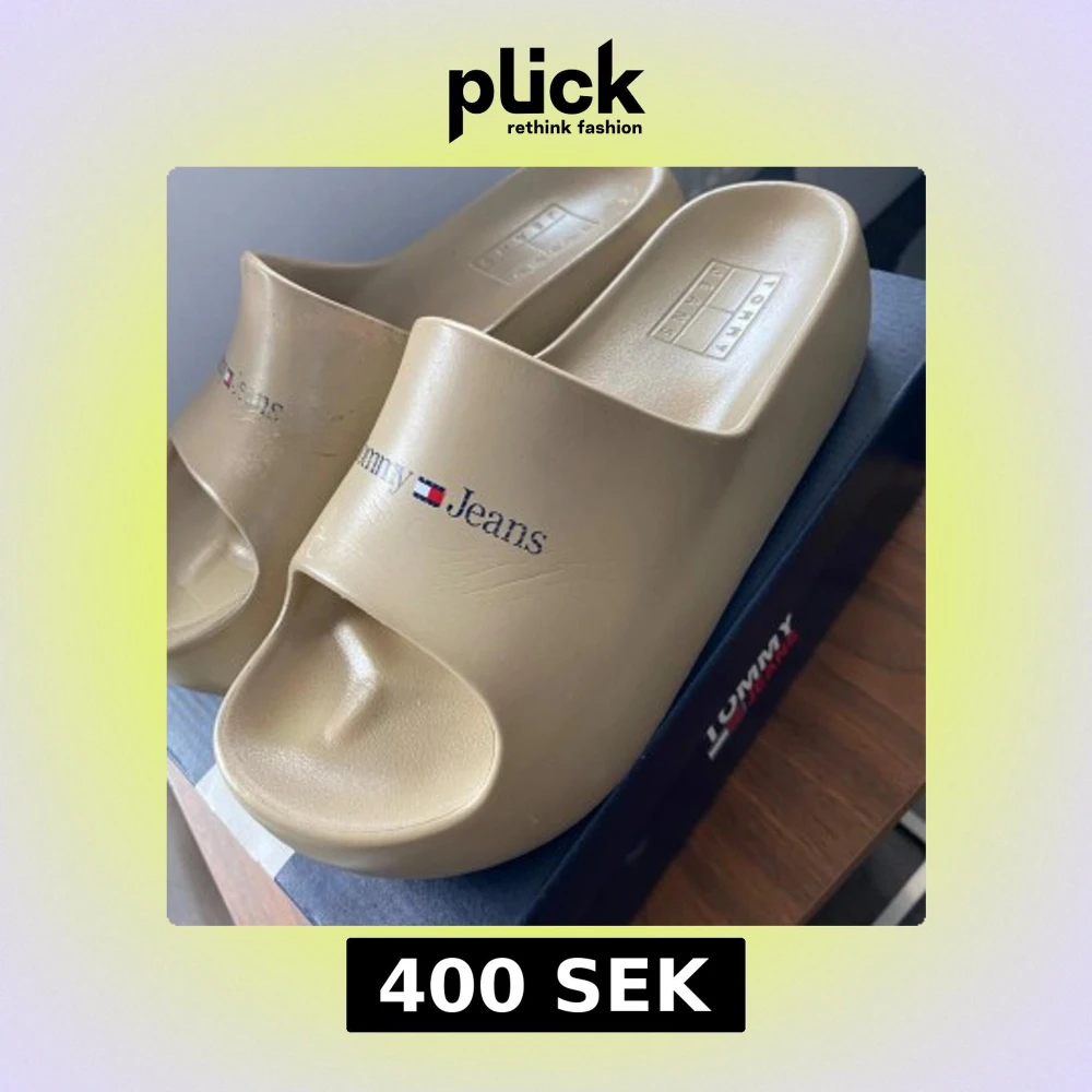 Säljer ett par beige sandaler från Tommy Jeans. De har en enkel och stilren design med öppen tå och märkets logotyp på ovansidan. Perfekta för en avslappnad stil. Storlek 39/40