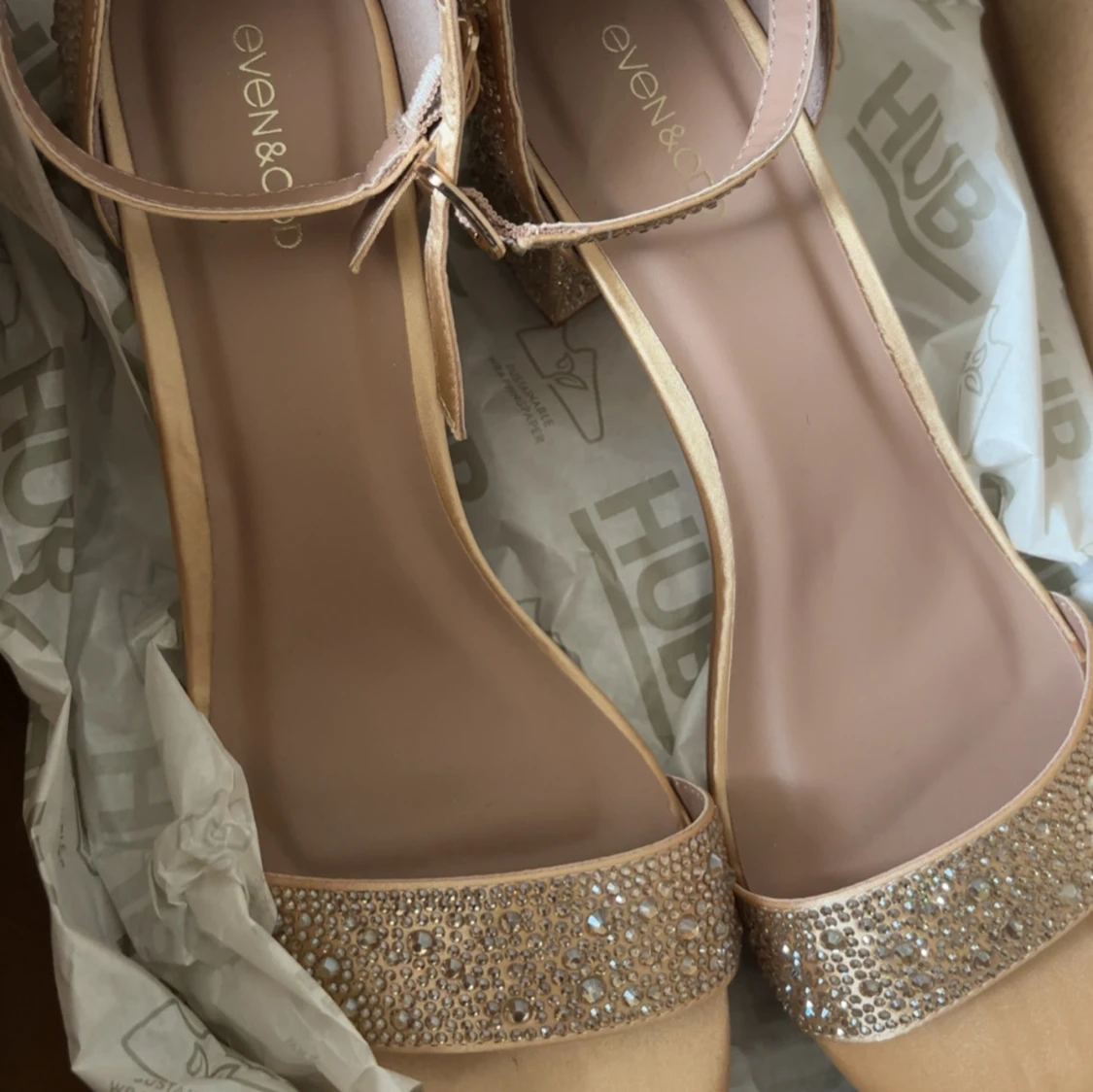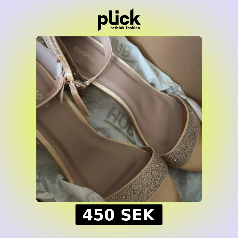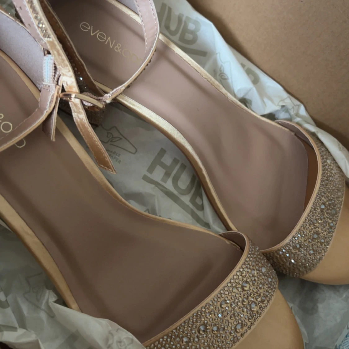 Säljer ett par snygga beige sandaler från Even&Odd med glittriga stenar på remmen över tårna. Skorna har en öppen tå och justerbar rem runt vristen. Perfekta för att lyfta din outfit med lite extra bling.