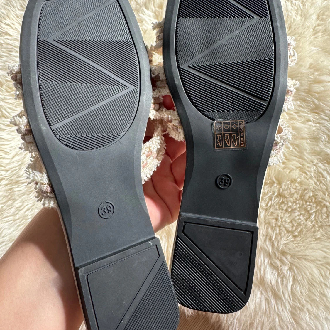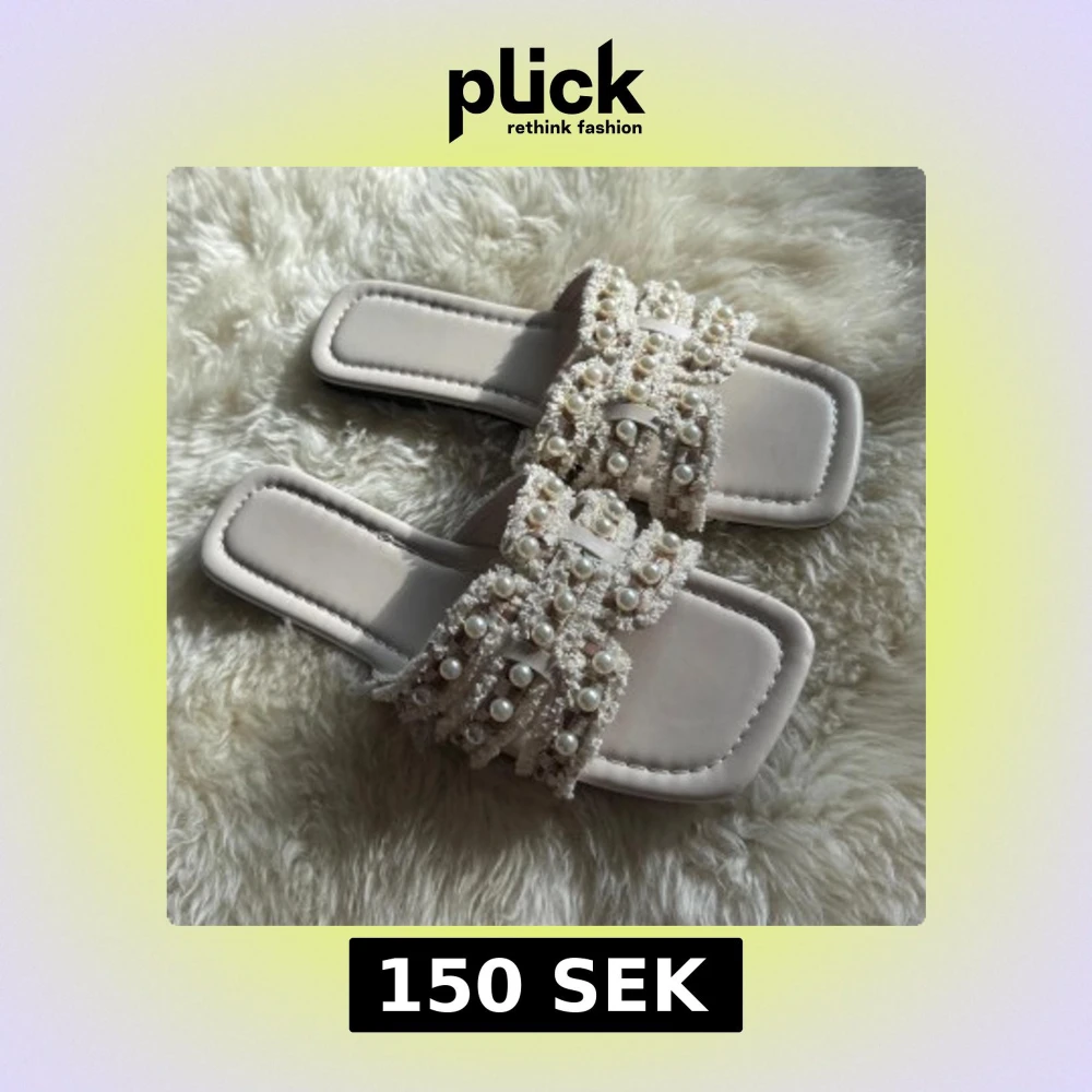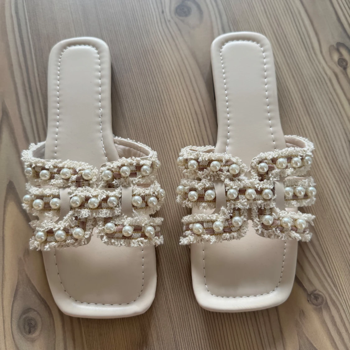 Superfina beige sandaler med fyrkantig tå och platt sula. Remmarna är dekorerade med pärlor och har en lyxig, texturerad look. Perfekta för att lyfta din sommarstil med en touch av elegans och trendig vibe.