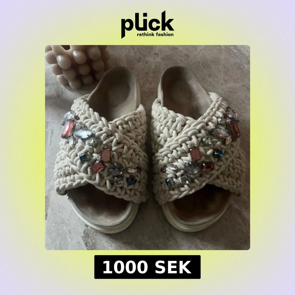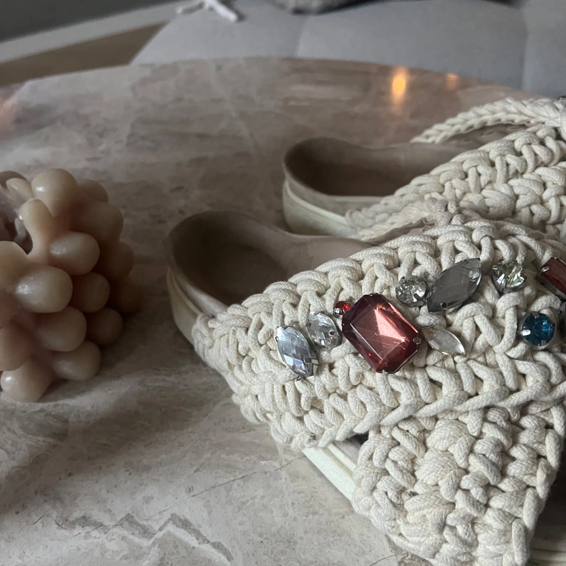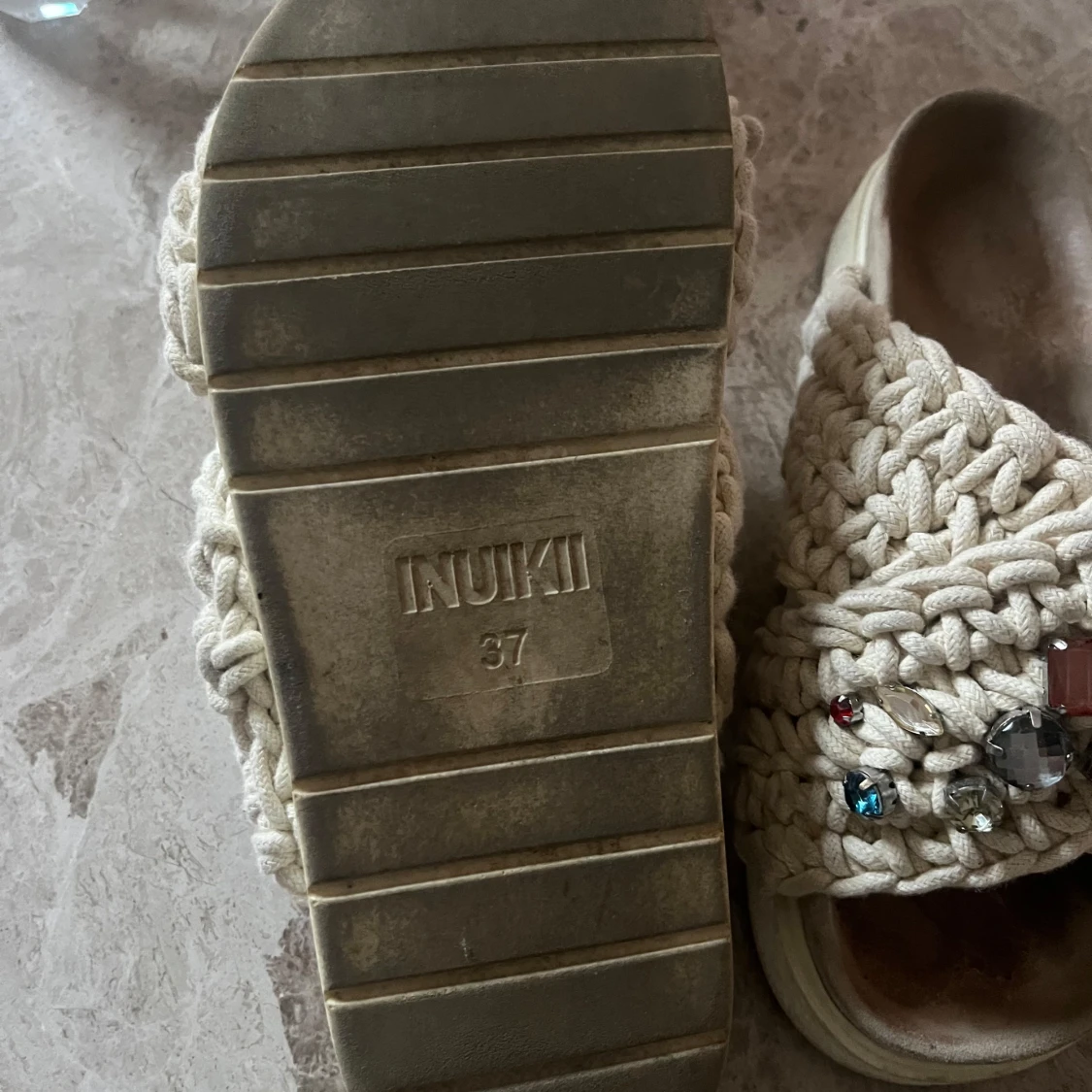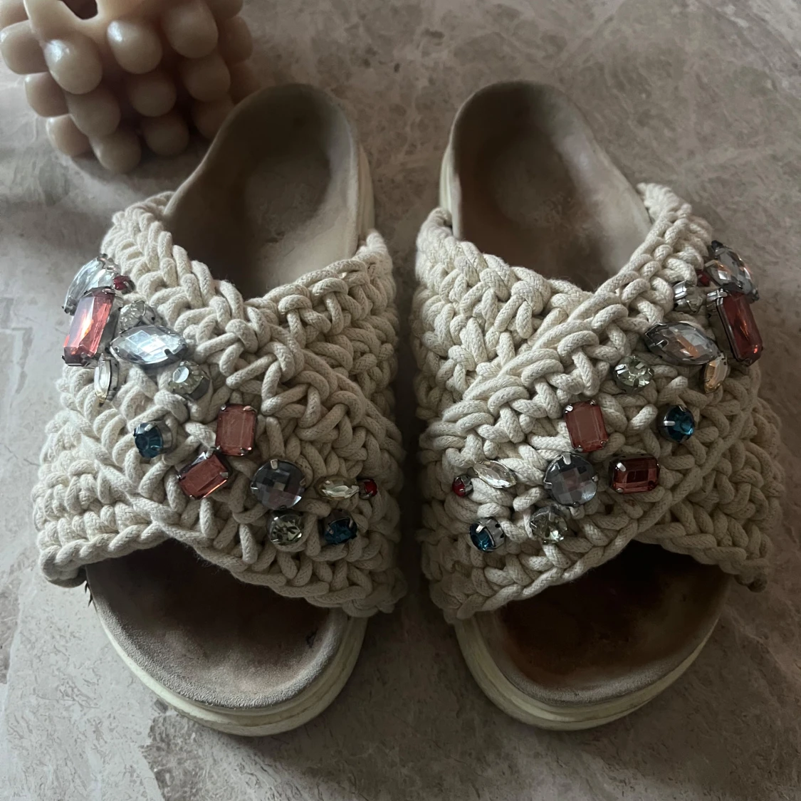 Unika sandaler från Inuikii i beige, grovt stickat material med breda korsade band. Dekorerade med stora färgglada pärlor och stenar i rosa, blått och silver. Platt sula och öppen tå, perfekta för en trendig sommarlook.