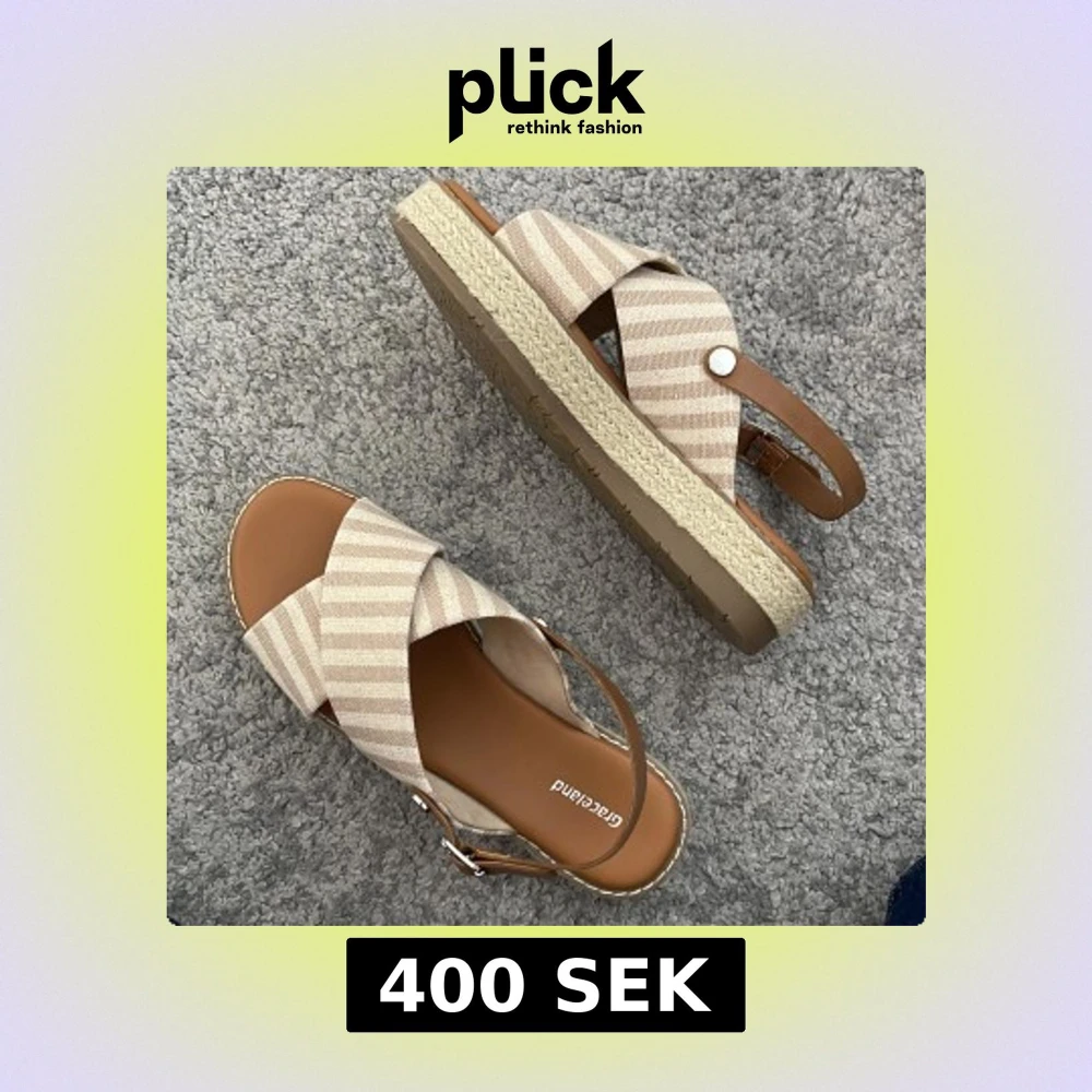 Snygga sandaler i beige med breda, korslagda remmar och justerbar hälrem. Skorna har en platt sula med flätad detalj runt kanten och ett diskret randigt mönster på remmarna. Perfekta för varma dagar.