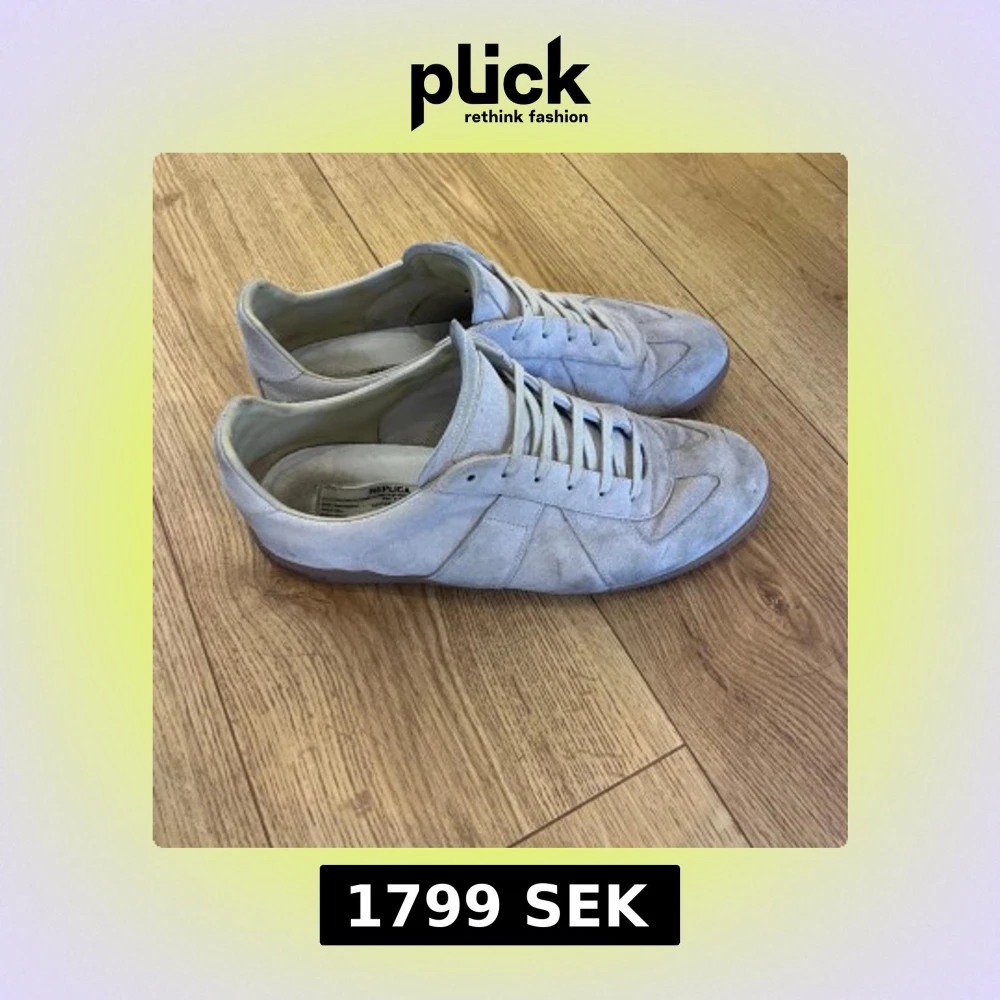 Säljer ett par stilrena sneakers från Maison Margiela. Skorna är i beige mocka med klassisk snörning och platt sula. De har en minimalistisk design med diskreta paneler och gummisula, perfekta för dig som gillar en clean look. Går att rengöras smutsiga just nu