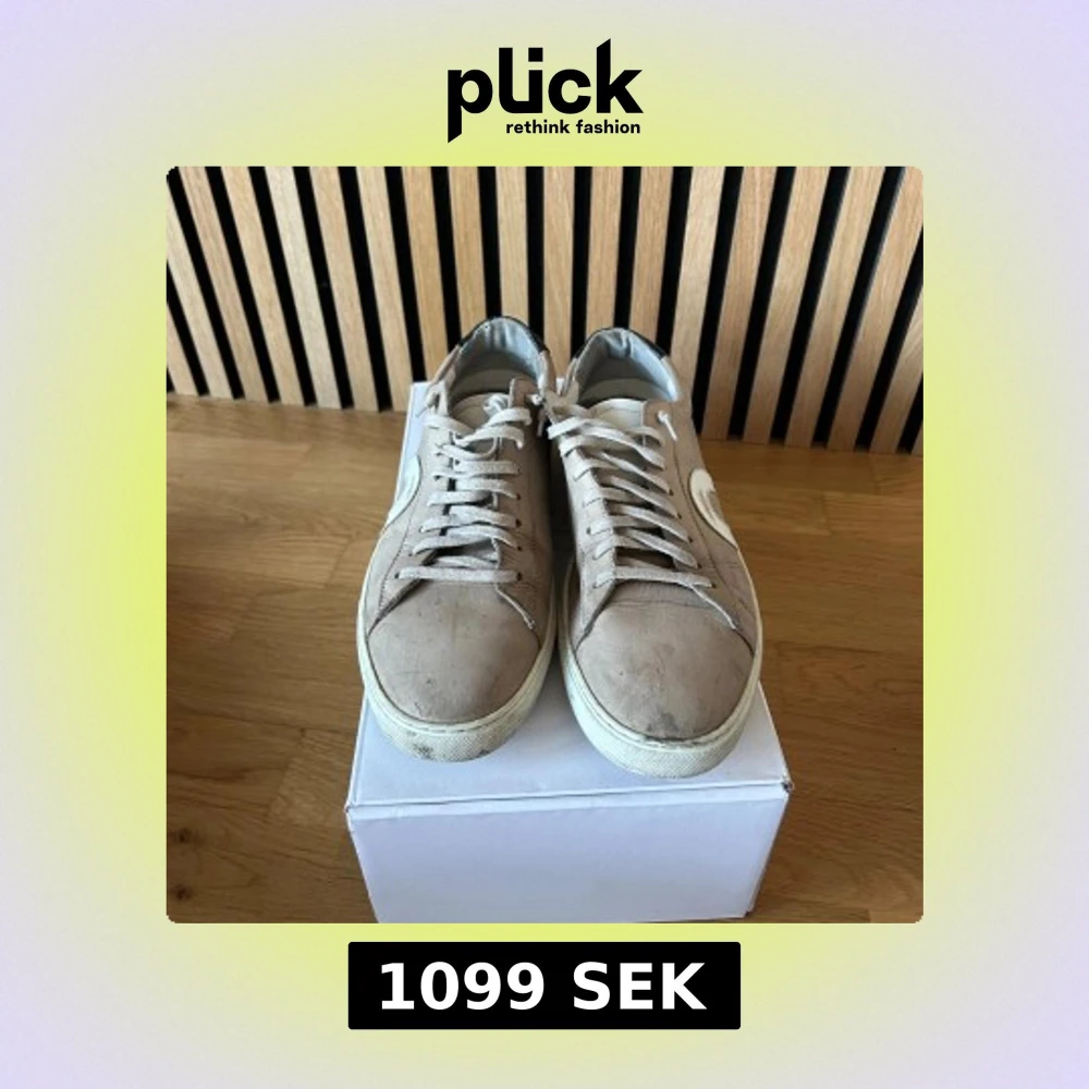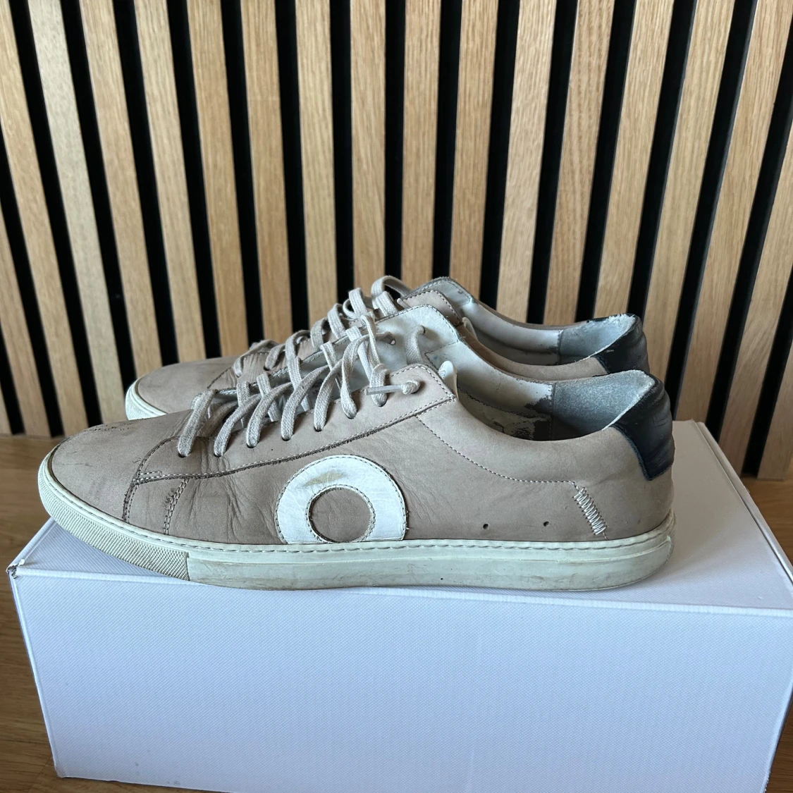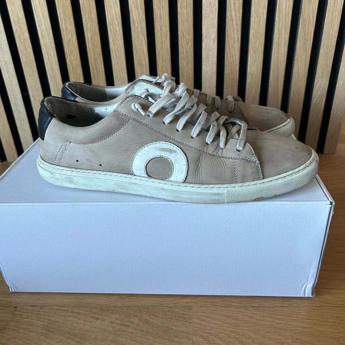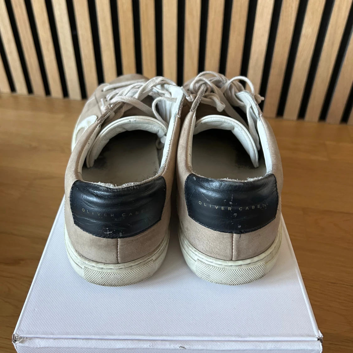 Snygga beige sneakers från Oliver Cabell med vit sula och vit cirkeldetalj på sidan. Skorna har snörning, rund tå och svart hälparti med logga. Tillverkade i mocka och skinn för en clean och stilren look.