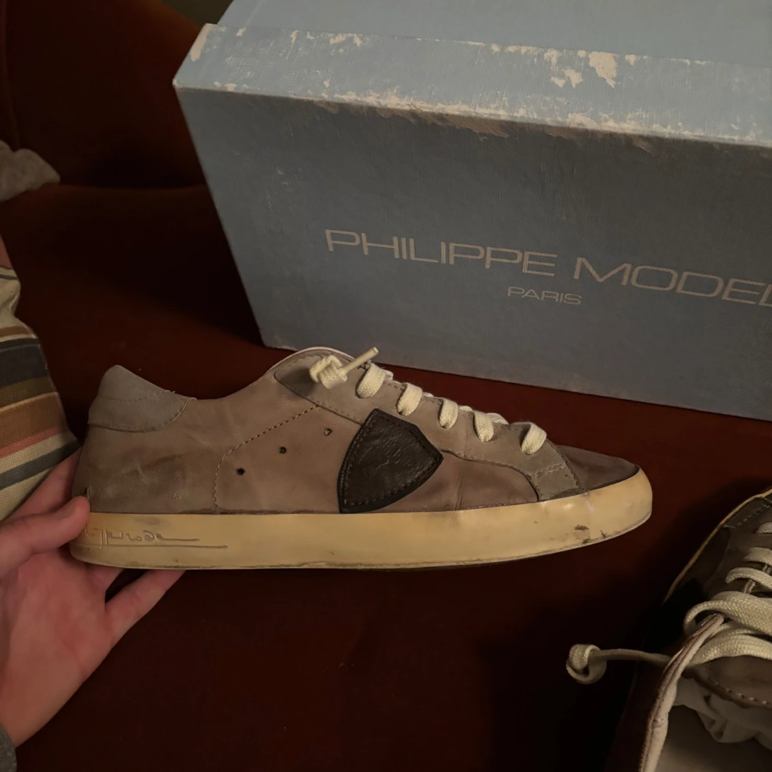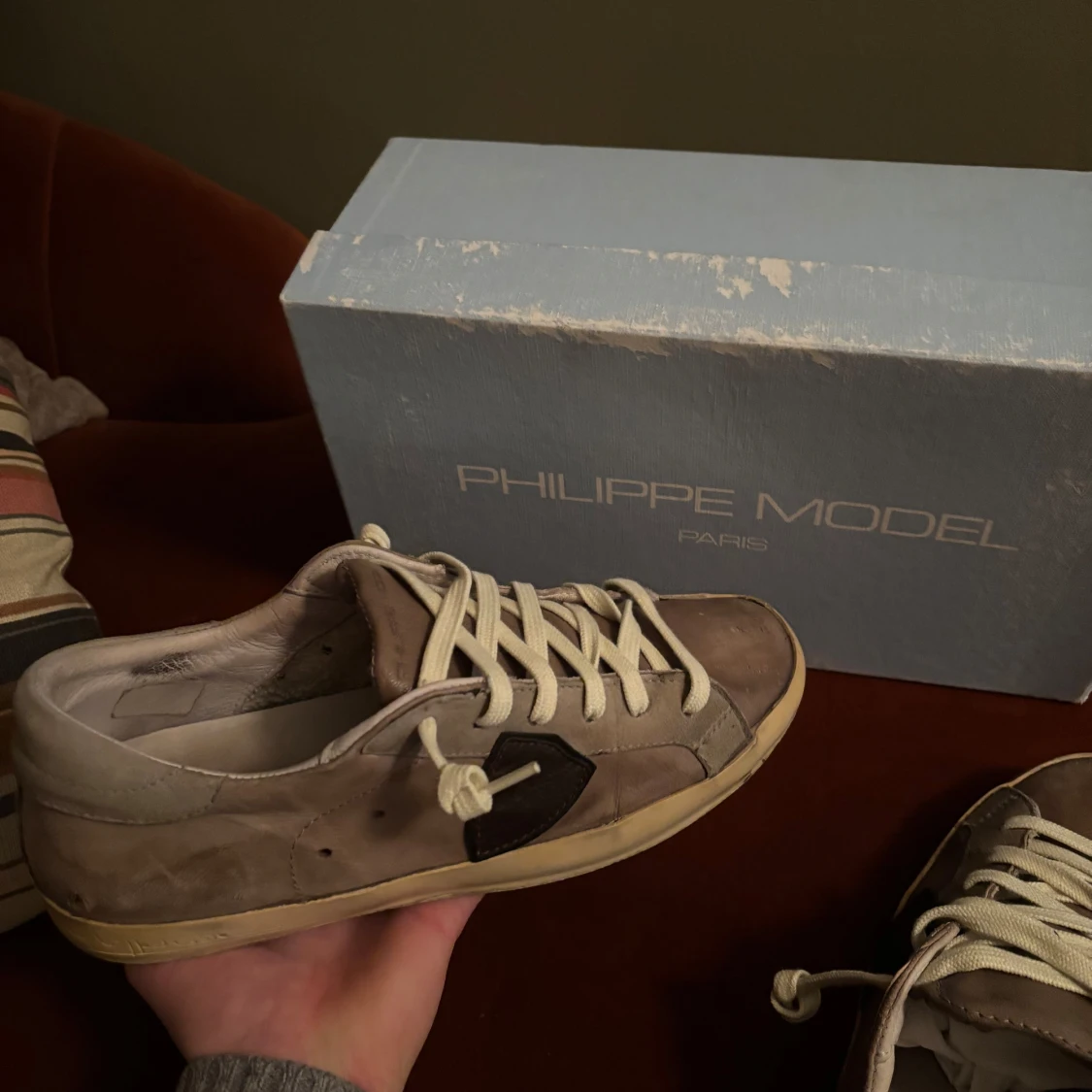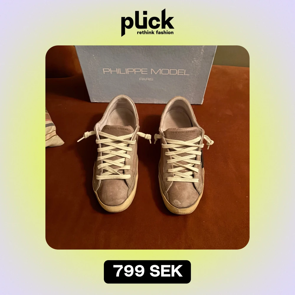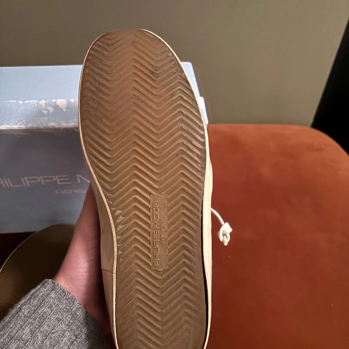 Snygga beige sneakers från Philippe Model med vita snören och en kontrasterande svart detalj på sidan. Skorna har en klassisk design med en bekväm sula och är perfekta för en stilren look.